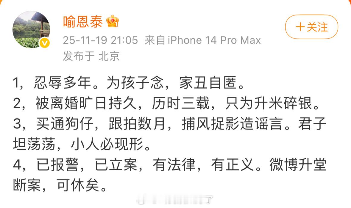 喻恩泰发微博正面回应了:家丑、妻子要钱、买狗仔跟拍造谣打舆论战、已经报警、已经立案。