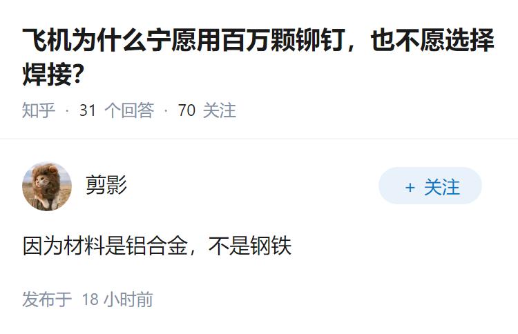 飞机为什么宁愿用百万颗铆钉,也不愿选择焊接?