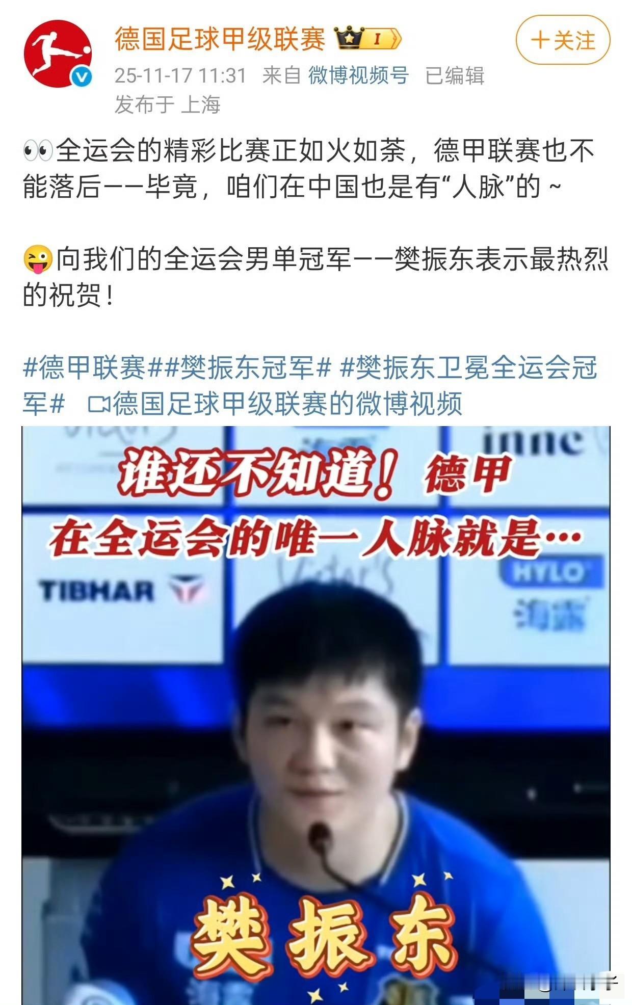 是因为樊振东可爱,所以这个世界才这么可爱吗? 德国足球甲级联赛官方发文恭祝樊振东全运会夺冠,并配图称:德甲在全运会的唯一人脉是:樊振东! 是的,德甲还给樊振东加上“唯一”性! 不得不说德甲太爱樊振东了!德甲还是太高端了,太会玩了。 不得不说全世界都爱着樊振东这个男人! 是因为樊振东在乒坛的权威不容置疑吗?对的。但是我觉的还因为樊振东太可爱了。 和他一起,谁都会变得开心,变得可爱,这个世界都变得可爱了。 樊振东 德甲