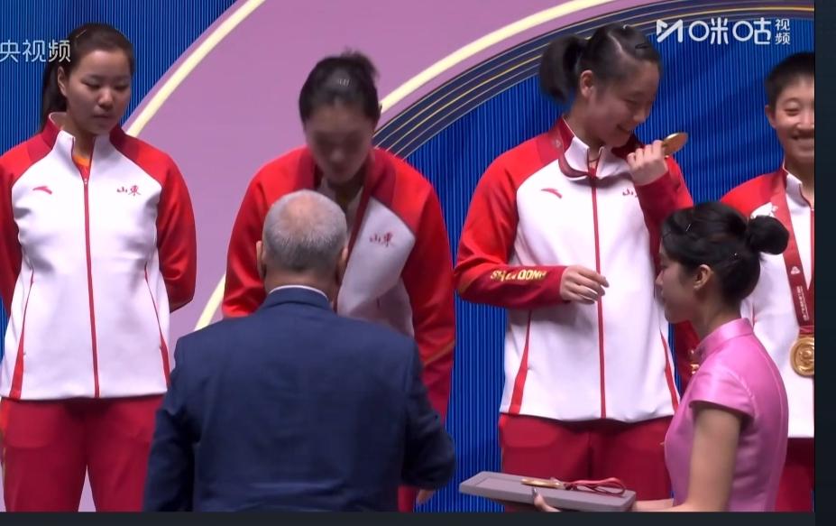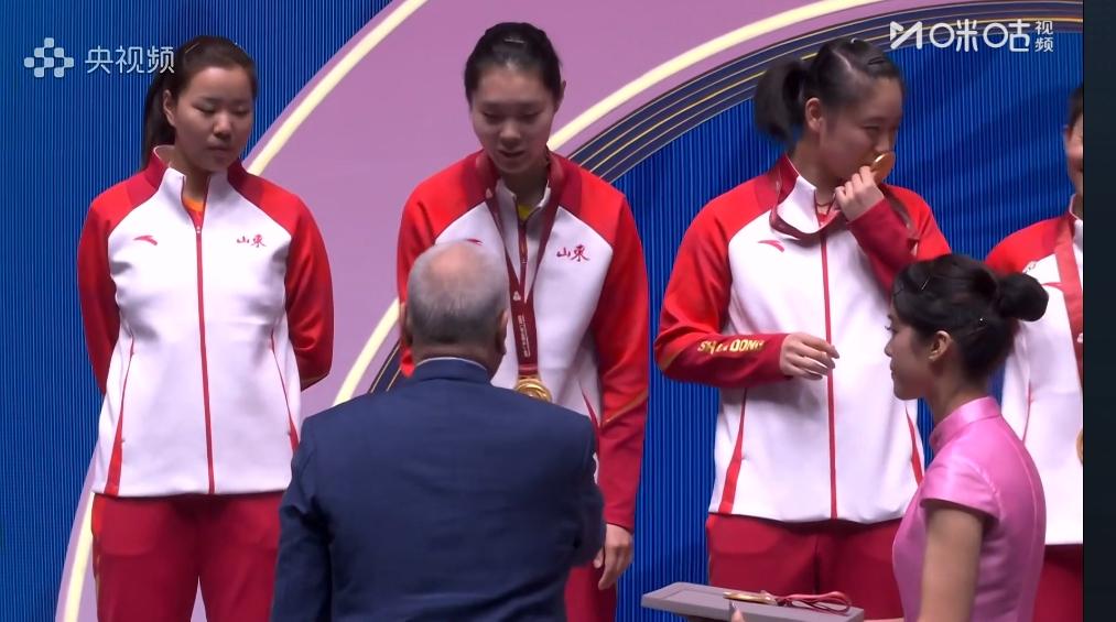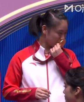 山东女团夺冠 最开心的是徐奕 拿起金牌仔细的看 深情的亲吻金牌 徐奕努力吧 学习曼玉姐姐 争取更好的成绩 山东女团