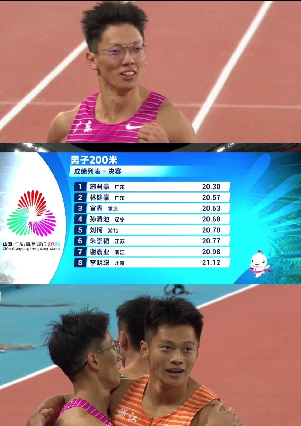 全运会男子200米决赛,施君豪20秒30夺金!谢震业20秒98第七!恭喜新人施君豪200米夺冠,老将谢震业谢幕之战!明天就是苏炳添最后一舞了!😮💨