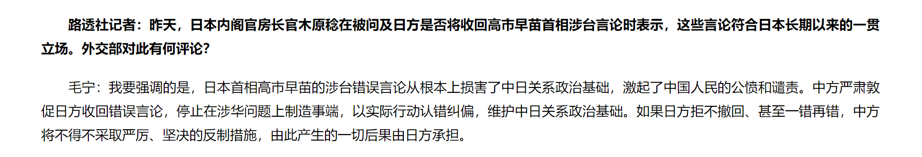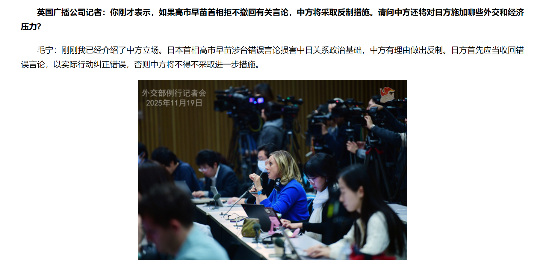 🔻2025年11月19日,外交部发言人毛宁主持例行记者会。🔻路透社记者:昨天,日本内阁官房长官木原稔在被问及日方是否将收回高市早苗首相涉台言论时表示,这些言论符合日本长期以来的一贯立场。外交部对此有何评论?🔻毛宁:我要强调的是,日本首相高市早苗的涉台错误言论从根本上损害了中日关系政治基础,激起了中国人民的公愤和谴责。中方严肃敦促日方收回错误言论,停止在涉华问题上制造事端,以实际行动认错纠偏,维护中日关系政治基础。如果日方拒不撤回、甚至一错再错,中方将不得不采取严厉、坚决的反制措施,由此产生的一切后果由日方承担。🔻英国广播公司记者:你刚才表示,如果高市早苗首相拒不撤回有关言论,中方将采取反制措施。请问中方还将对日方施加哪些外交和经济压力?🔻毛宁:刚刚我已经介绍了中方立场。日本首相高市早苗涉台错误言论损害中日关系政治基础,中方有理由做出反制。日方首先应当收回错误言论,以实际行动纠正错误,否则中方将不得不采取进一步措施。🔻via 外交部网站