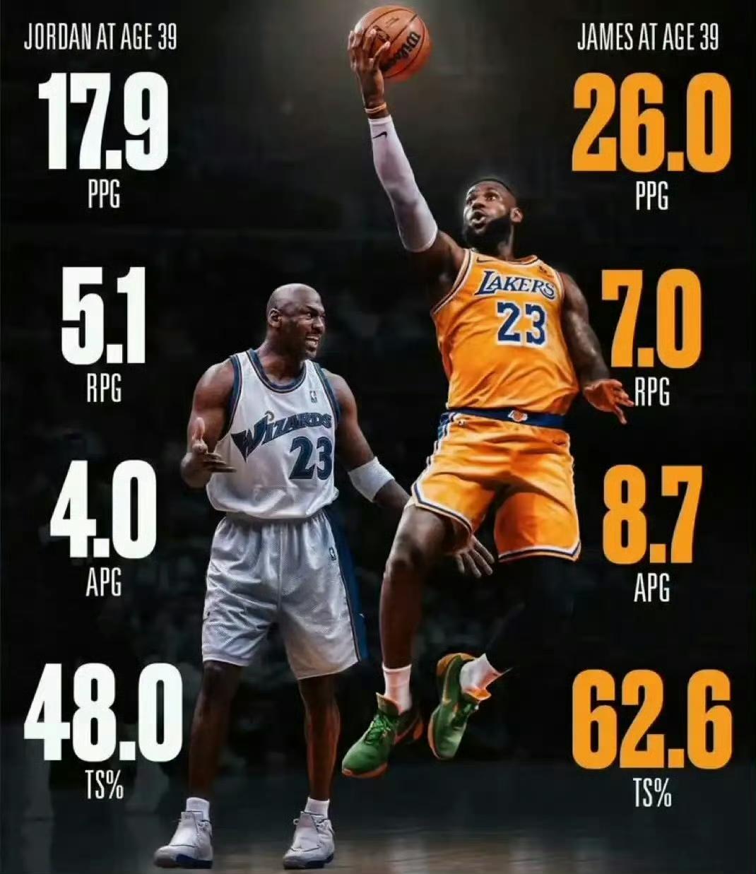 这岁数,詹姆斯就是NBA历史第一人! 39岁的乔丹 vs 39岁的詹姆斯 ! 詹姆斯39岁(2023 - 2024赛季)的常规赛数据全面领先乔丹39岁(2002 - 2003赛季),尤其在得分、助攻、篮板和投射效率上优势明显! 乔丹39岁时处于奇才复出阶段,打法仍偏传统中距离,三分投射本就非其强项; 而詹姆斯39岁时适配现代篮球风格,既能个人得分,还能串联球队组织进攻,再加上自身超强的身体保养能力,让他在该年龄段依旧保持着联盟顶级的竞技水准。 詹姆斯 勒布朗·詹姆斯 湖人球星詹姆斯 乔丹 篮球巨星詹姆斯 nba 詹姆斯 勒布朗詹姆斯
