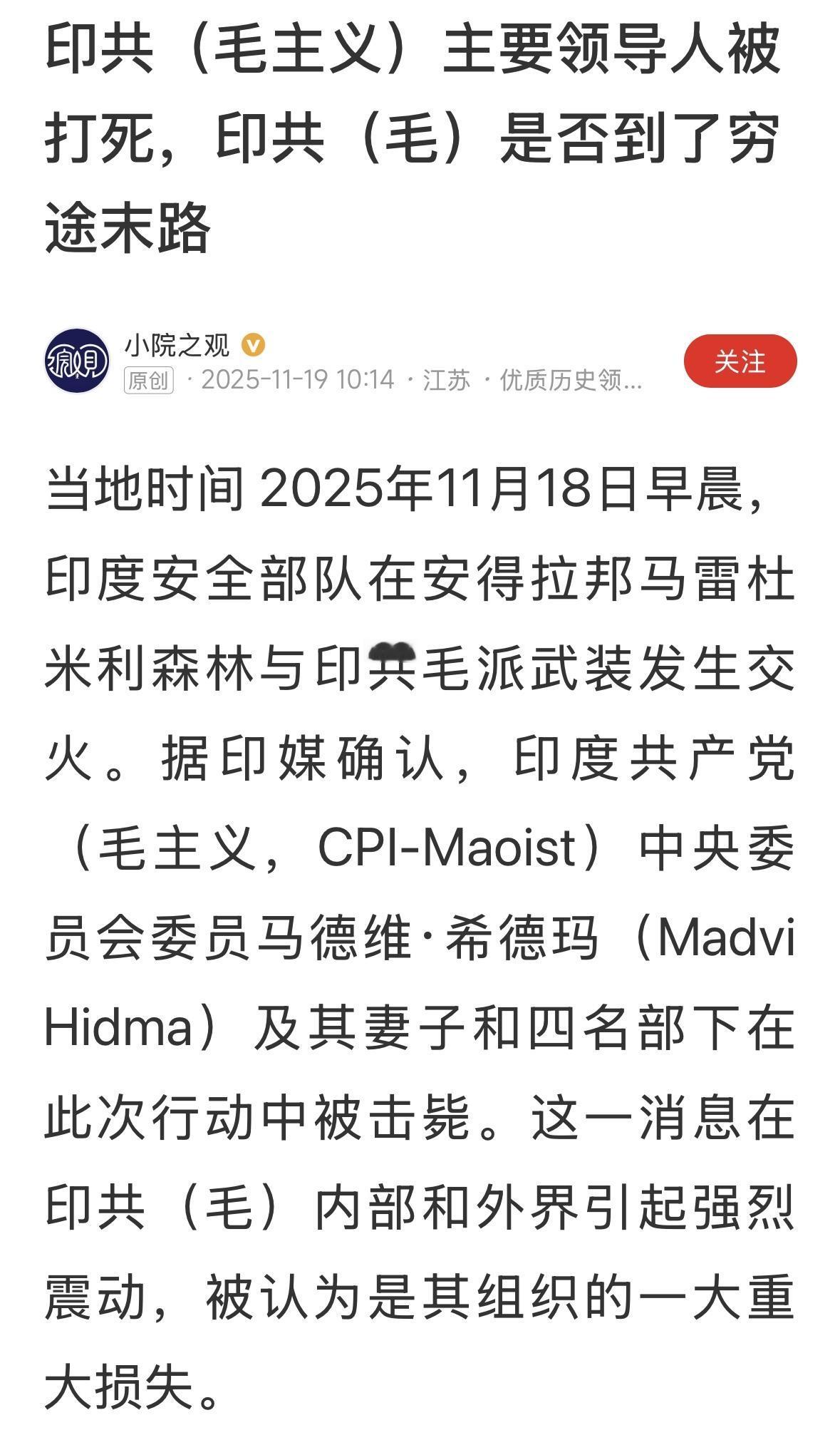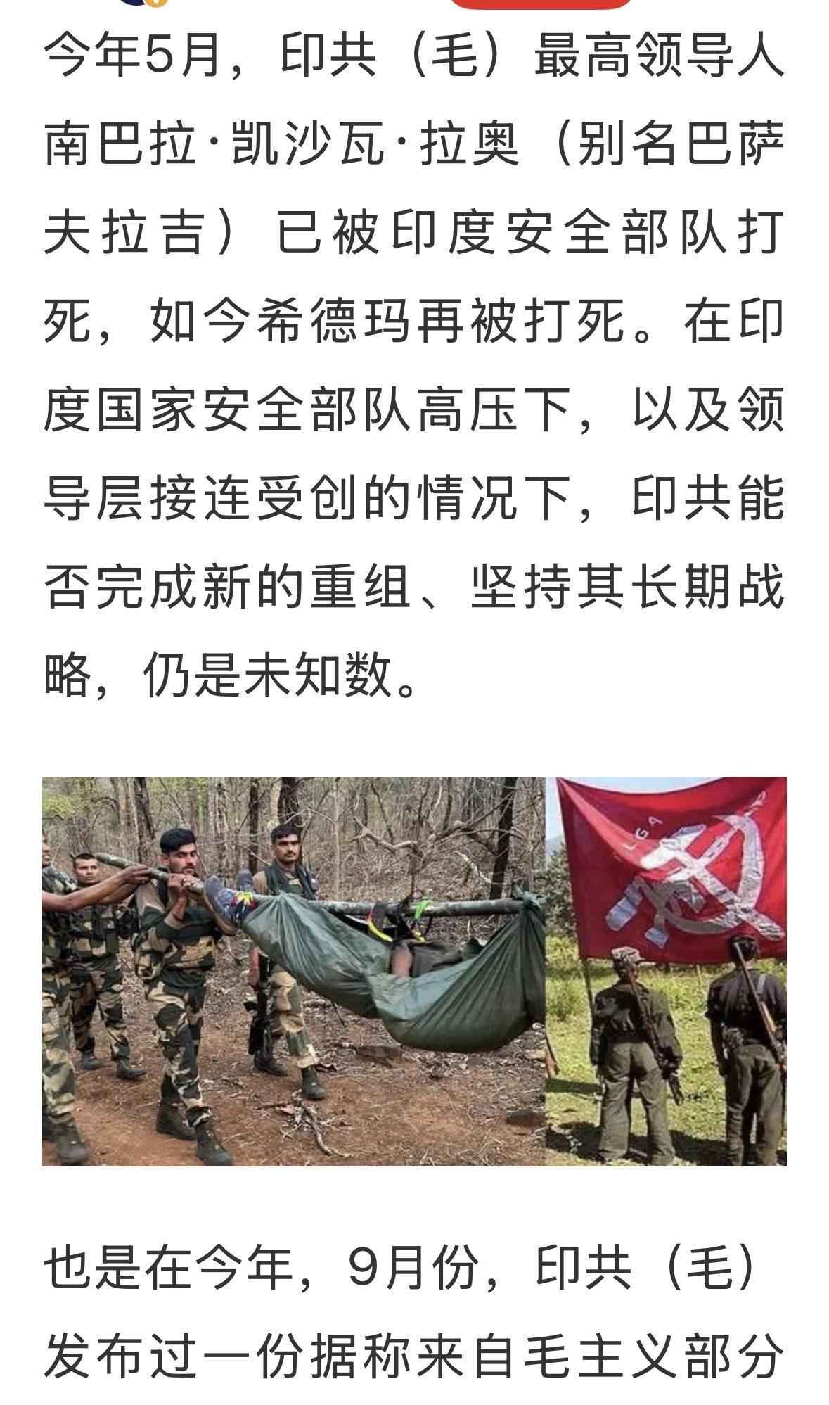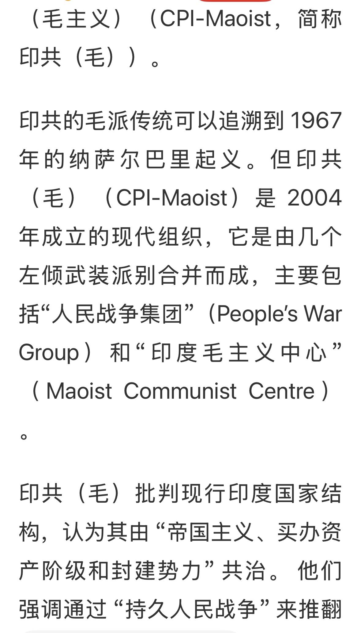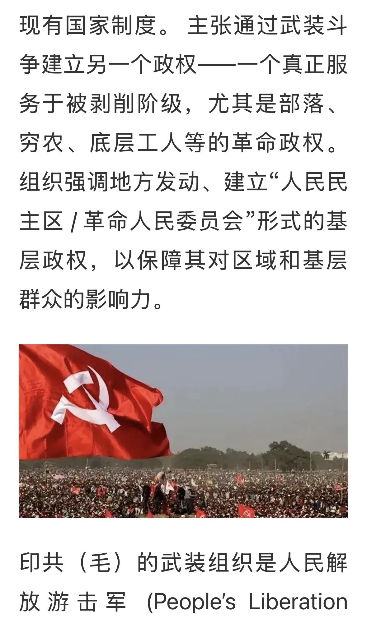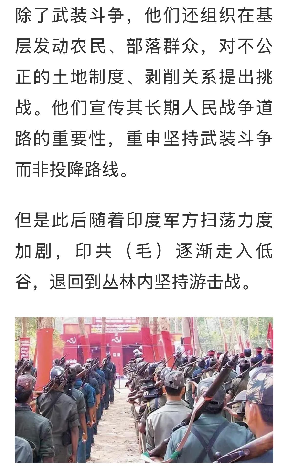 印度共(毛)在极端艰苦的环境中,坚持武装斗争,他们坚信枪杆子里面出政权,但是,起步晚了几十年,没有赶上社会主义运动的高潮,现在没有国际共产主义的援助和支持,以及指导,困难太大了。