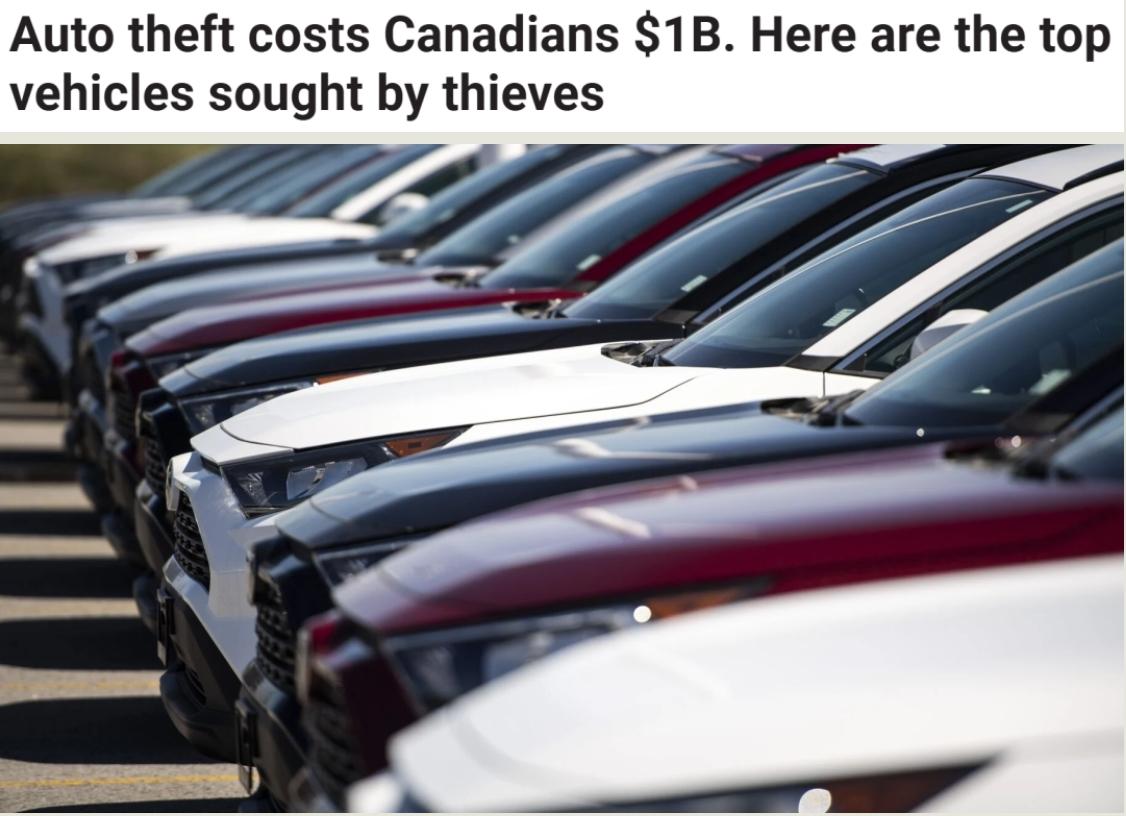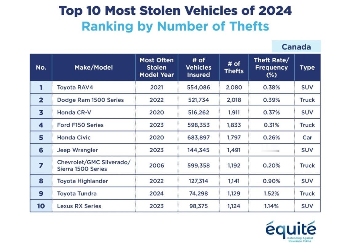 加拿大最容易被盗的车辆排行榜出炉! 丰田RAV4高居榜首 加拿大汽车盗窃问题一直非常严重,最新报告显示,尽管去年全国汽车盗窃案件数比2023年下降了19%,但根据保险犯罪机构Équité估算,汽车盗窃给加拿大社会带来的保险成本依然超过10亿加元。 尽管近年加拿大联邦政府和执法机构不断加大打击力度,但犯罪集团正迅速调整手法,汽车盗窃问题依旧严峻。根据报告,新款、高价的 SUV 和皮卡仍然是犯罪分子的主要目标。其中丰田RAV4连续占据加拿大最受窃车辆榜首,去年共有2,080辆被盗。 报告解释称,RAV4因为“全球需求量大、适用性强、二手市场价值高”,使其成为盗贼能快速套现的理想目标。 在前十名榜单中,除排名第五的本田思域(Honda Civic)以外,其余均为 SUV或皮卡车型,包括本田CR-V、Jeep牧马人、道奇Ram、福特F-150 等。 其中丰田品牌共有三款车上榜,包括Highlander以及Tundra,使丰田成为出现次数最多的汽车制造商。 Équité公布的2024年加拿大最常被盗车辆排名如下: • 丰田 RAV4 — 2,080起 • 道奇 Ram 1500 系列 — 2,018起 • 本田 CR-V — 1,911起 • 福特 F-150 — 1,833起 • 本田思域 — 1,797起 • Jeep 牧马人 Wrangler — 1,491起 • 雪佛兰/GMC Silverado/Sierra 1500 系列 — 1,192起 • 丰田 Highlander — 1,141起 • 丰田 Tundra — 1,129起 • 雷克萨斯 RX 系列 — 1,124 起 这十款车在2024年共计被盗超过15,700辆。