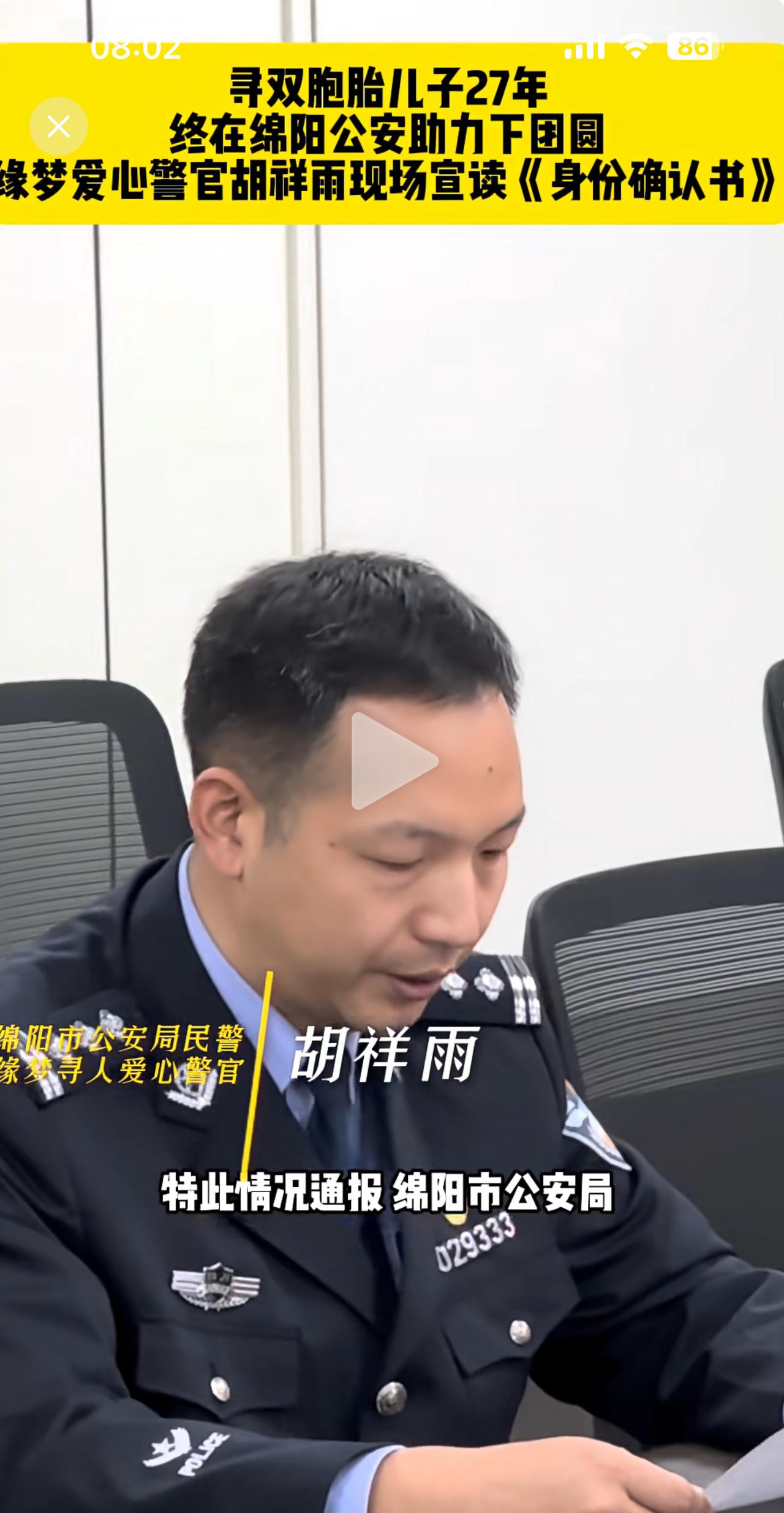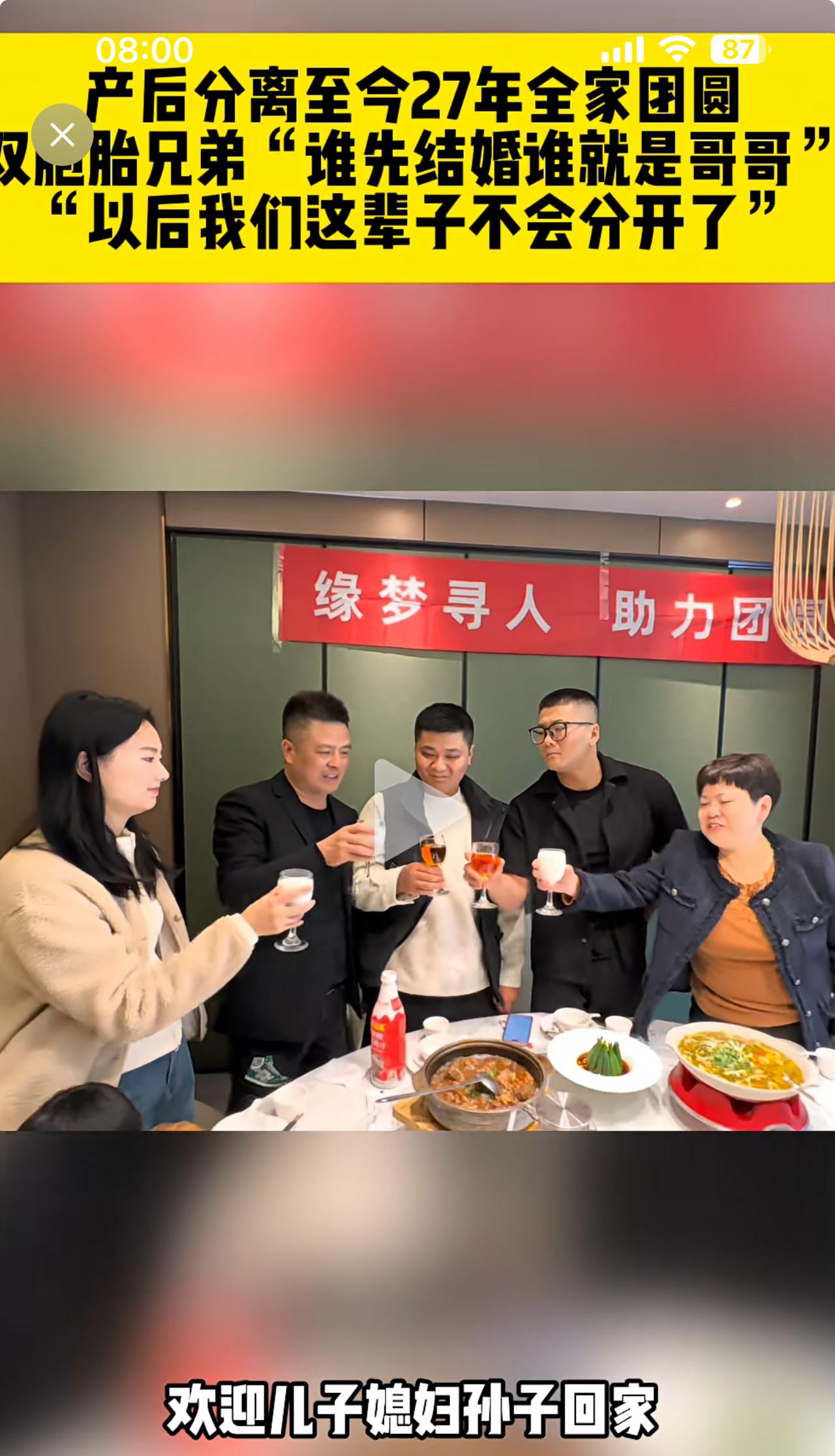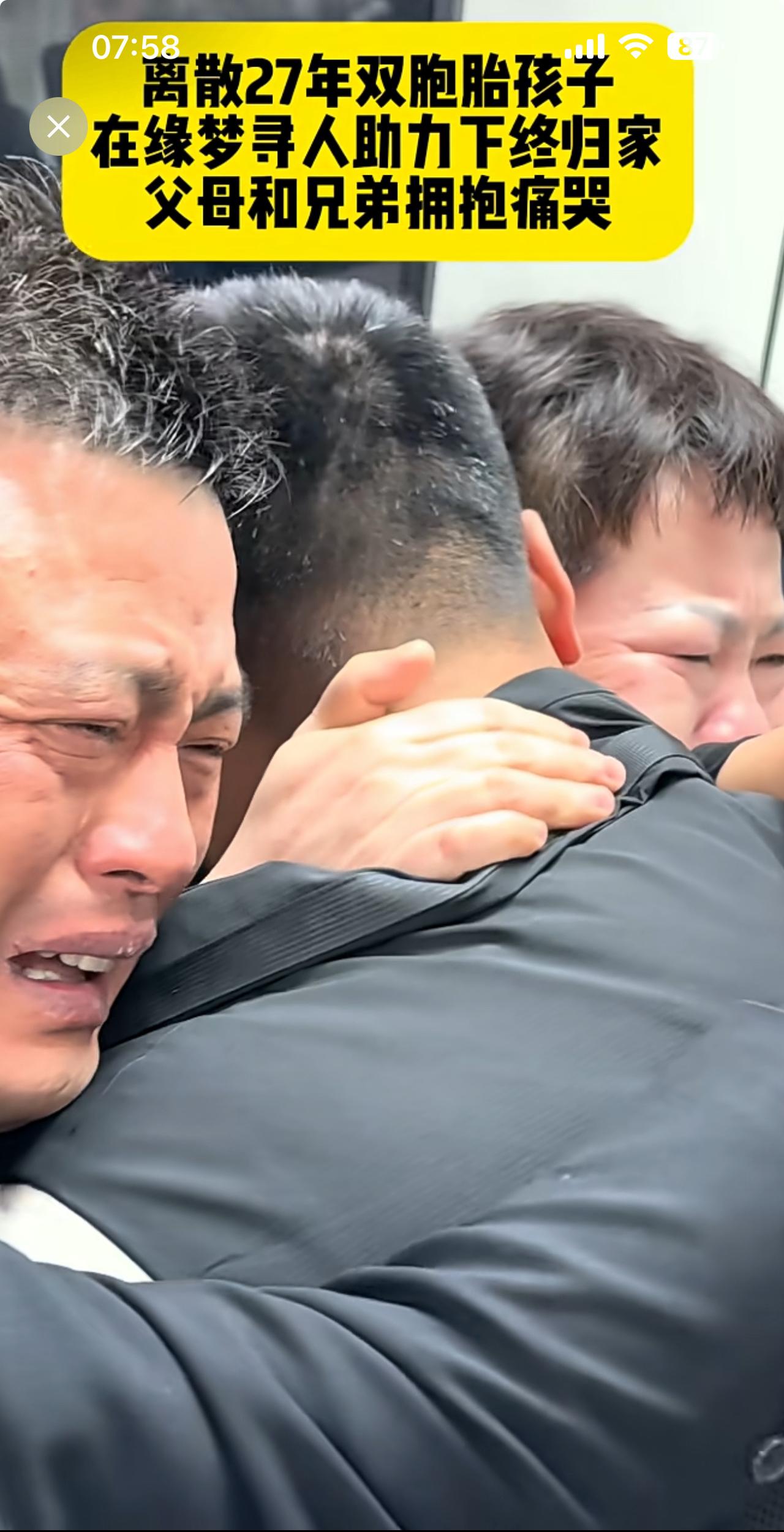 一早就刷到了绵阳失散27年的双胞胎兄弟团聚的视频!真替他们高兴。 这是不幸之中的幸运。想想生活中还有多少人终其一生都没有找到自己的亲人。 27年来,作为父母这一边花时间、花精力,不停寻找,充满愧疚自责、背负精神压力。另一边被抱走的孩子,经历着苦涩的童年和成长!一个好端端的家庭硬生生的就被某些人拆散了。 现在是时候追责算账了!当时做手术的医生是谁?哪些护士参与手术?是谁抱走了孩子?为什么要这么做?必须给出答案。
