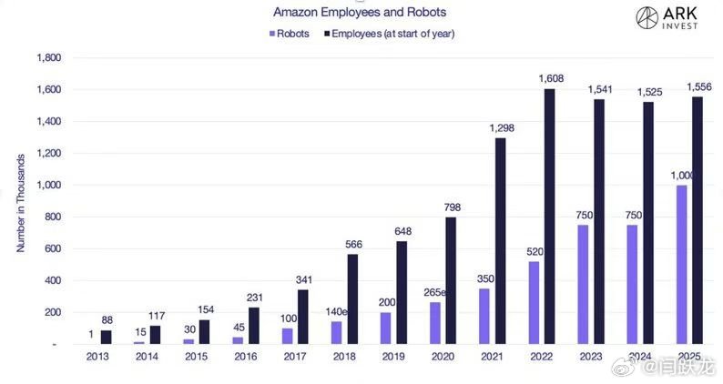 从2013年至2025年,亚马逊机器人数量呈现持续增长态势,由最初的1千台逐步攀升至2025年的100万台;同期员工数量(年初统计)也从8.8万人增长至155.6万人。其中,2020年机器人数量出现显著跃升(达26.5万台),2022年员工数量达到峰值160.8万人后略有回落。整体来看,机器人部署速度在后期明显加快,而员工规模则在高位趋于平稳。人智共创的特征越来越明显。