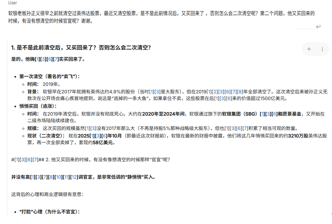 最搞笑的就是那个软银老板孙正义,早在2019年就清空英伟达股票,注意是清空,不是减持。损失数千亿美金,然后抱着老黄痛哭的画面,尤在眼前。后来AI时代来了,悄悄建仓(没吱声),但是前不久高调清仓,引发市场哗然。注意这次又是高调清仓,不是减持,不是悄悄清仓。当然了,孙总两次投资都是赚钱,但是在这种清仓,还出来说一下,show一下眼光,不顾其他股东死活的做法,其嘴脸实在让人鄙视。视野和格局让我一个非专业小散都看不上。。