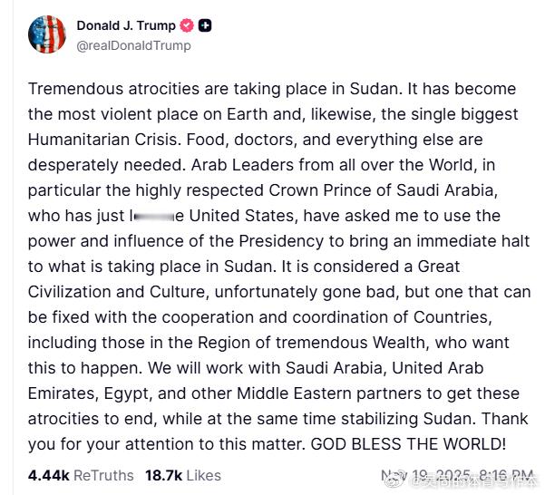 【黄金时代】川普关注苏丹人道主义灾难川普:苏丹正发生骇人听闻的暴行。它已成为地球上最暴力的地方,同时也是全球最大的人道主义危机中心。粮食、医生以及其他一切物资都急需。来自世界各地的阿拉伯领导人,特别是刚刚离开美国的备受尊敬的沙特阿拉伯王储,都请求我利用总统的权力和影响力,立即制止苏丹正在发生的暴行。苏丹曾被视为一个伟大的文明和文化国家,可惜如今已走向衰落,但只要各国,包括那些希望改变现状的地区富裕国家,通力合作与协调,就能扭转乾坤。我们将与沙特阿拉伯、阿拉伯联合酋长国、埃及以及其他中东伙伴合作,制止这些暴行,同时努力稳定苏丹局势。感谢各位对此事的关注。愿上帝保佑世界!