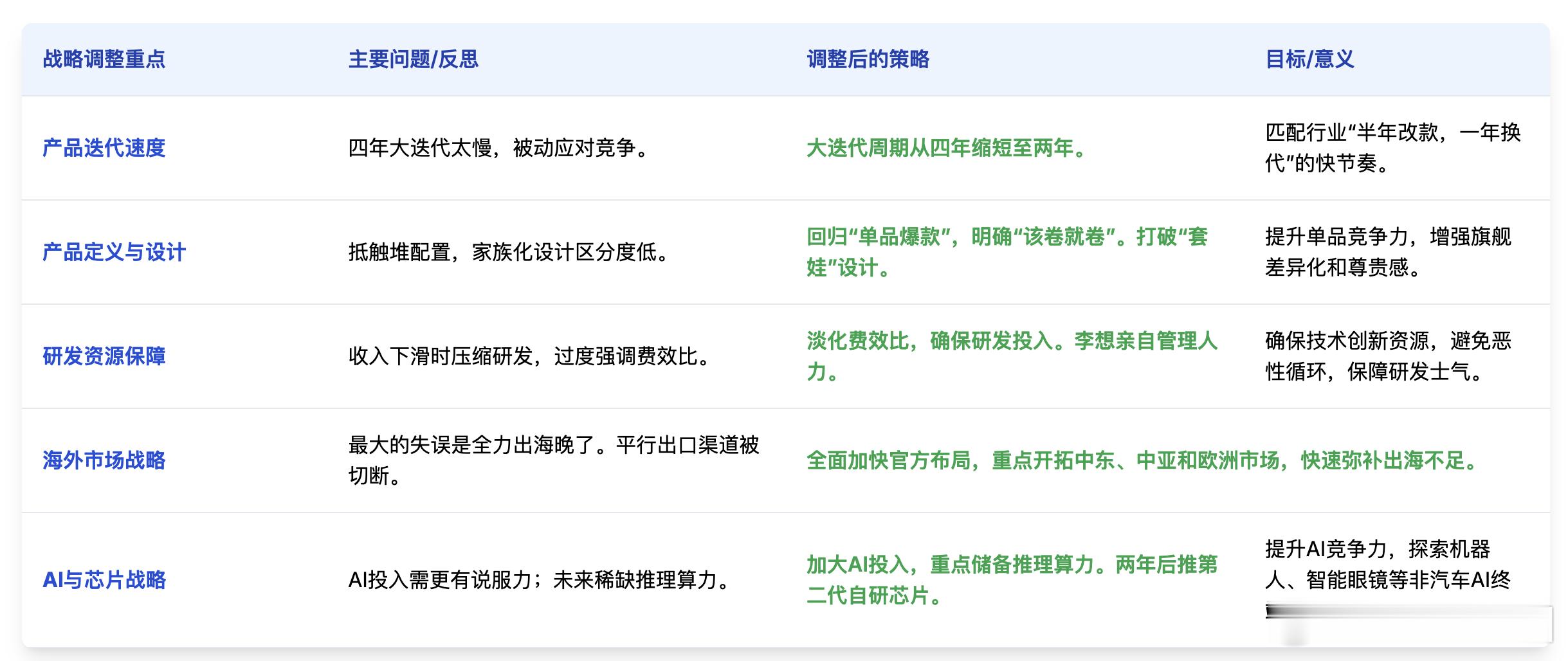 36氪写的稿子,我来给大家找一找重点,三天闭门会,理想第一次在内部承认——我们慢了,而且是真的慢了。产品节奏落后,被动出牌理想过去四年一个大平台,结果在“半年改款、一年换代”的新竞争周期里,被对手两倍速迭代围着打。i8、i6出现节奏错位,L系列从5万跌到2万。连李想自己都说,“我们出一次牌,同行出两次牌。”这次会后,理想决定把平台迭代从4年压到2年,并放弃过去“抵触堆料”的克制,单品爆款+极致堆料重新成为主线。出海战略判断失误过去两年理想认为出海不是重点,结果平行出口被政策一刀切,海外布局被小鹏、零跑、蔚来全面甩开。战略会上明确反思:“最大的失误,是全力出海晚了。”接下来理想将全面加速中东、中亚、欧洲市场,2026年起新车都要适配海外法规。AI投入要再加码未来稀缺的是推理算力。理想现在每月算力投入超1亿元,自研的第二代芯片将在两年后上车,完全对标行业顶级推理芯片,理想要把AI的边界拓到机器人、可穿戴终端,而不是只局限在车上。