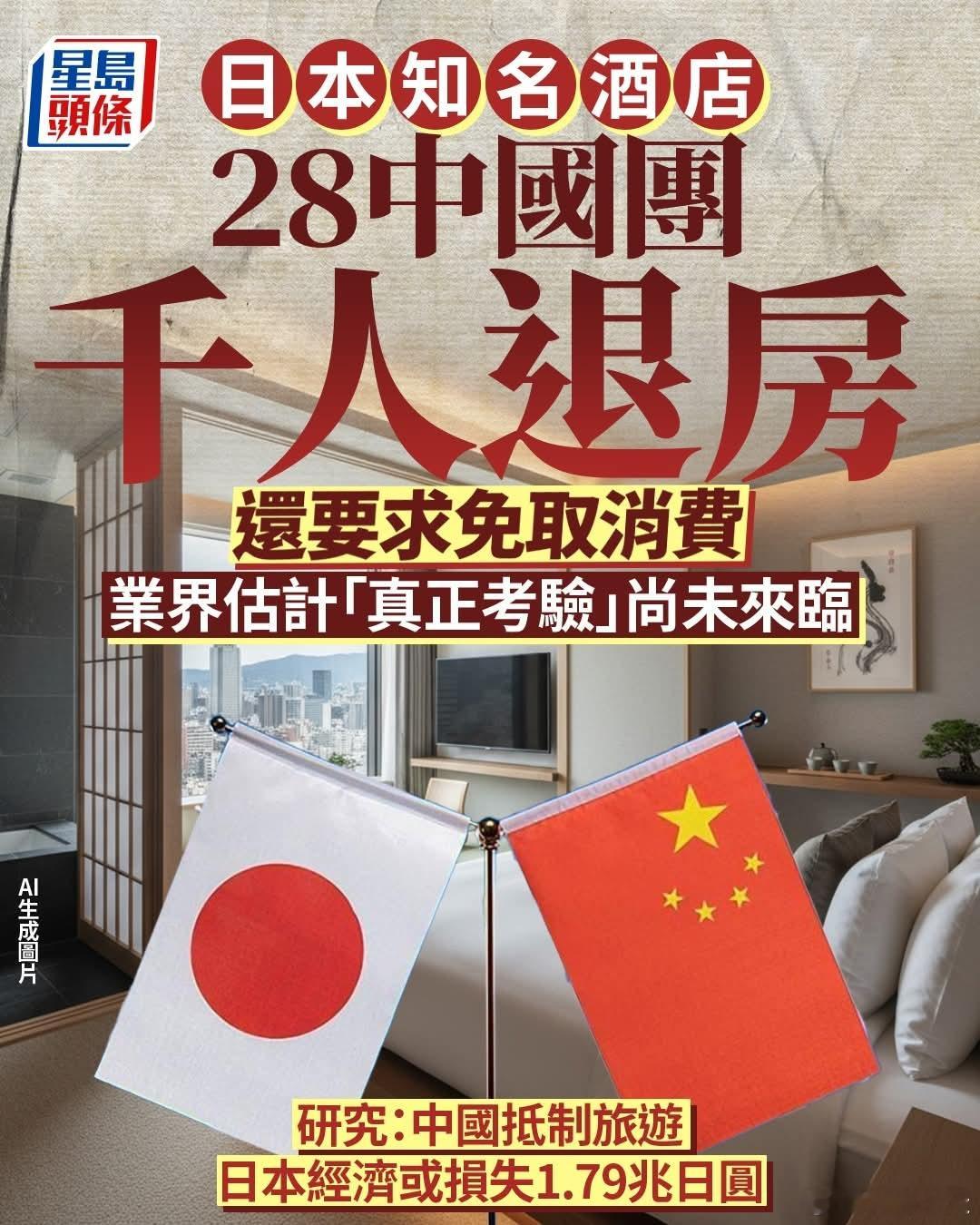 日本酒店爆中国旅行团「蒸发潮」中部日本放送(CBC)报道,酒店负责人竹内惠子透露,自16日起便接到中国旅行社接二连三的退订通知,「光是十一月,就有28个旅行团取消,涉及约1000名游客。今年剩余的订单几乎全被取消。」她直言原因明确:「是政治情势的影响。」竹内指出,饭店约一半客源来自中国,馆内各处都设有醒目的中文指示牌。她坦言,虽曾历经2012年日本将钓鱼岛「国有化」后的退订潮,但这次情况异常:「从未遇过在收到最终名单后才突然取消,更糟糕是,还要求免收取消费。」她形容饭店营运正面临巨大的压力与不安。竹内表示,目前还看不到取消潮的尽头,「前景可以说是非常黯淡。这不只影响我们一间饭店,而是波及整个地区的旅游业。」报道又指,日本业界真正的考验,是在明年2月的中国春节旺季,「一般时期的两至三倍入住量,如果出现连锁取消,冲击将无可避免。」