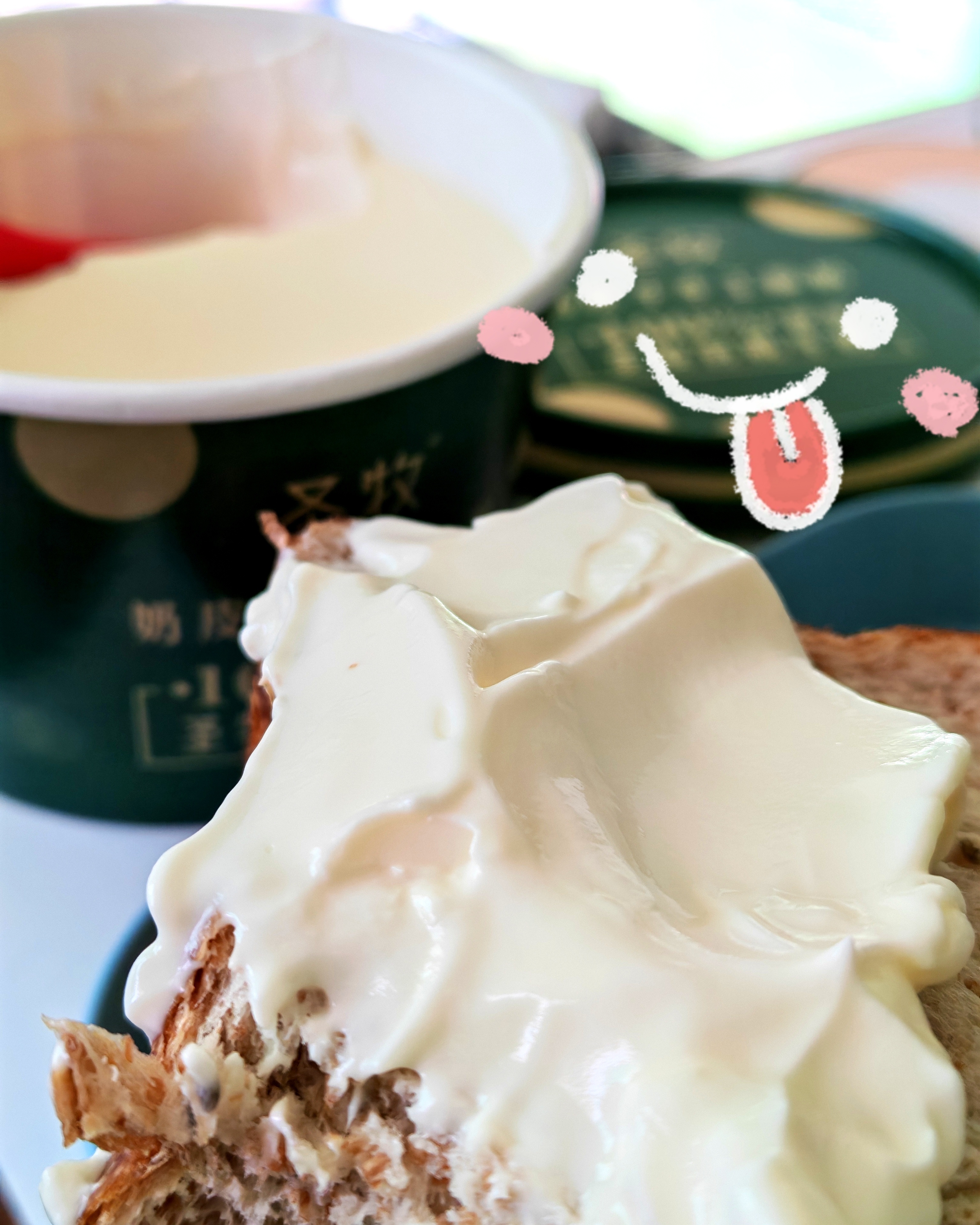 来来来,吃货的分享 用奶皮子酸奶厚厚涂抹在面包上 吃去吧,保证你喜欢