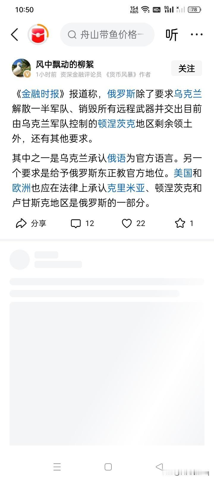 痴心不悔? 据网络上有消息说,俄罗斯在与美国对结束乌克兰战争的谈不上中,向乌克兰提出了自己的条件: 1,要求乌克兰军队撤出全部的顿涅茨克地区,交给俄罗斯。 2,解散乌克兰现有50%的军队,并且销毁所有的远程武器。 3,承认俄罗斯语在乌克兰的官方地位,与此同时,还要给予俄罗斯东正教官方地位。 4,要求美国和欧洲在法律上正式承认克里米亚、顿涅茨克等地是属于俄罗斯的一部分。 据说,好像俄罗斯方面曾经不止一次承认过,乌克兰是个主权国家。但是,从上面的条件,似乎看不到乌克兰这个国家有什么主权,甚至是根本就没有主权可言。而且,从上面的那些条件看,更多看到的好像是竹篮打水,望洋兴叹,白日做梦。 特别是,假如乌克兰同意上述俄罗斯的条件,乌克兰又干什么要坚持进行抵抗三年多、快四年的战争?难道美国人的不清楚这些情况?实际上好像是,美国人当然是非常清楚,但美国大概是不惜牺牲乌克兰,也要将俄罗斯拉入自己的怀抱,共同对付另外的国家。