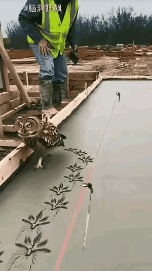工人师傅刚刚倒完水泥板,突然间一只猫头鹰飞到了水泥上面,在水里面走来走去。男子看到猫头鹰后敢怒不敢言,猫头鹰可是国家一级保护动物,只能眼巴巴的看着猫头鹰走来走去。 这哪是闯祸,分明是大自然派来的“专属设计师”啊!都说人鸟之间难免有小冲突,但换个角度看,这何尝不是最生动的共生瞬间。保护动物从不是冷冰冰的规定,而是这种“愿意包容”的温柔,毕竟它们的出现,本就是生态变好的证明。 那些凌乱的脚印,可比刻意雕刻的图案鲜活多了。成年人的通透,就是懂得在规则里找浪漫,在小遗憾里藏惊喜。我们守护它们的生存空间,它们回馈一份不期而遇的小确幸,这才是人与自然最好的相处模式。 你遇到过野生动物闯祸的可爱瞬间吗?评论区分享下你是怎么化解的~