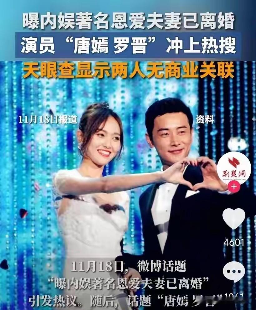 今天热搜第一名,唐嫣罗晋离婚! 记得他们两个可恩爱了,从结婚开始,一直给别人的感觉都是恩爱有加,怎么突然离婚了,这么一比较,我离婚也不算啥,起码也就几个粉丝关注,做不到上热搜。 演艺圈真是把感情生活也变成了演戏,感情来的快,电影结束,两个人的婚姻也就到头了。 不理解他们的感情为什么这么不稳定, 他们俩本来是我们特别看好的一对儿, 简直太突然了,就这么离了, 据说两个人相关的动态都没了, 估计真离了,就是还没听到两个人的正面回应。 无风不起浪,如果没离婚,就有新剧要上映了。