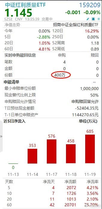 11月20日,两市红盘整理。截至13时33分,中证红利质量ETF(159209)跌0.09%,资金热度不减,据WindLevel2实时行情结合均价预估,盘中净流入超400万,截至发稿,该基金获资金连续5日净流入,累计约2500万,年初以来累计净流入约1.3亿,以实时成交价估算,盘中预估规模超5亿,创历史新高。