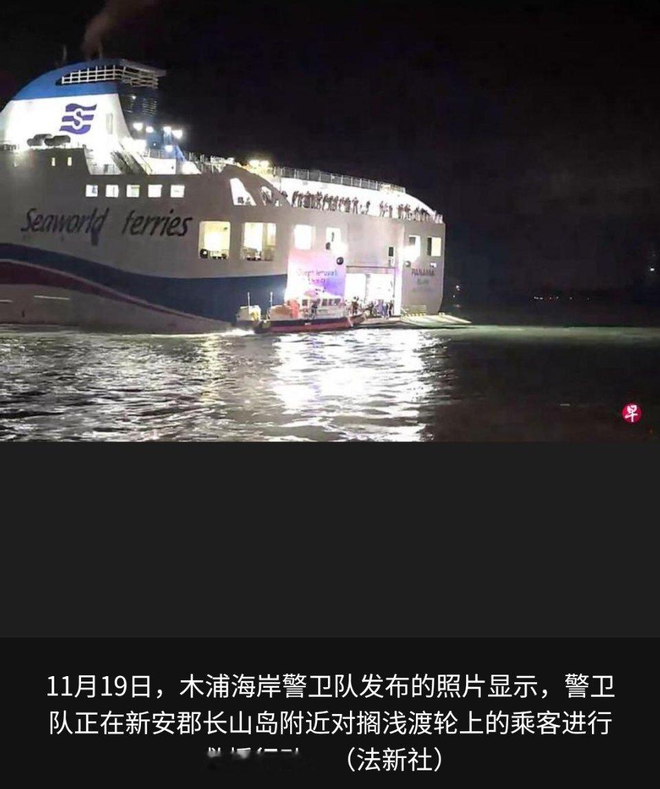 在韩国全罗南道新安郡长山岛附近海域搁浅的客轮,船上人员已全部获救,其中三人轻伤,无人死亡。据韩国木浦海洋警察署消息,这艘客轮载有246名乘客和21名船员,星期三(11月19日)从济州出发前往木浦市。截至当地时间星期三晚上11时27分,船上人员全部获救,并转送至全罗南道木浦海警专用码头。该海域靠近2014年“世越号”沉船事故的地点,那次事故造成300多人死亡,其中大部分是前往学校旅行的学生。