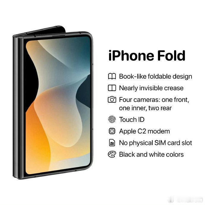 要来了Apple也快有折叠屏手机了 。其7.74英寸内屏采用三星独家供应的"无折痕"技术,外屏5.49英寸,电池容量达5400-5800mAh。新机搭载台积电2nm工艺A20芯片,配备侧边Touch ID及双后置镜头,铰链采用液态金属材料,但量产仍存挑战。据Mark Gurman透露,该机预计2026年秋季上市,售价约2000美元(约1.4万元人民币)。