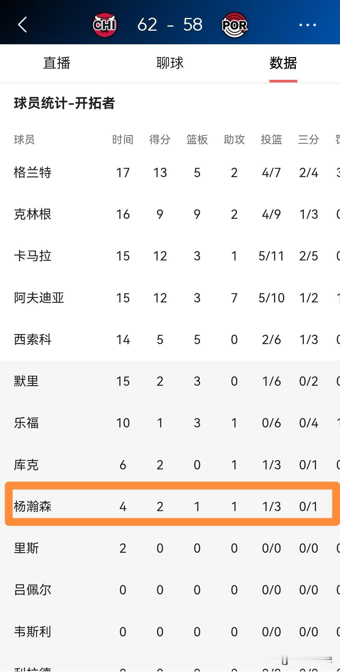 开拓者主帅斯普利特真是不懂知人善任!在今天开拓者主场迎战公牛的比赛中,目前双方半场战罢,开拓者以58:62落后于对手。值得一提的是,新秀杨瀚森在上半场比赛中的状态看起来非常不错,但是杨瀚森仅仅得到了4分钟的出场时间得到2分1篮板1助攻。 坦白说,斯普利特教练在杨瀚森状态不错的时候就应该增加杨瀚森的上场时间,如果杨瀚森在上半场比赛中的上场时间能够上双,我相信开拓者肯定能够领先公牛。