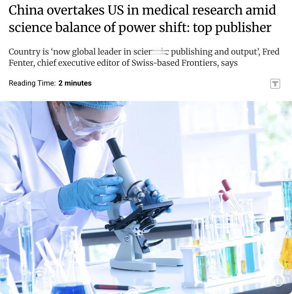 外媒:根据瑞士学术出版商Frontiers的首席执行编辑Fred Fenter的说法,中国在医学研究领域已经超越美国,成为全球科学出版和产出的领导者。 数据显示,2024年中国研究人员发表了110万篇文章,而美国为88万篇。在医学领域,2023年中国占全球论文的40%,2024年这一比例上升到超过50%。 这表明中国在科学研究领域的影响力正在快速提升,传统的科学强国地位正在发生转移。