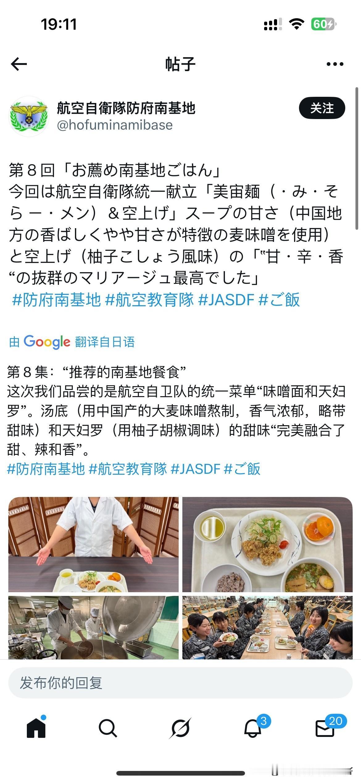 11月20日,日本航空自卫基地官方账号发文展示他们午餐: “推荐的南基地餐食” 这次我们品尝的是航空自卫队的统一菜单“味噌面和天妇罗”。汤底(用中国产的大麦味噌熬制,香气浓郁,略带甜味)和天妇罗(用柚子胡椒调味)的甜味“完美融合了甜、辣和香”。