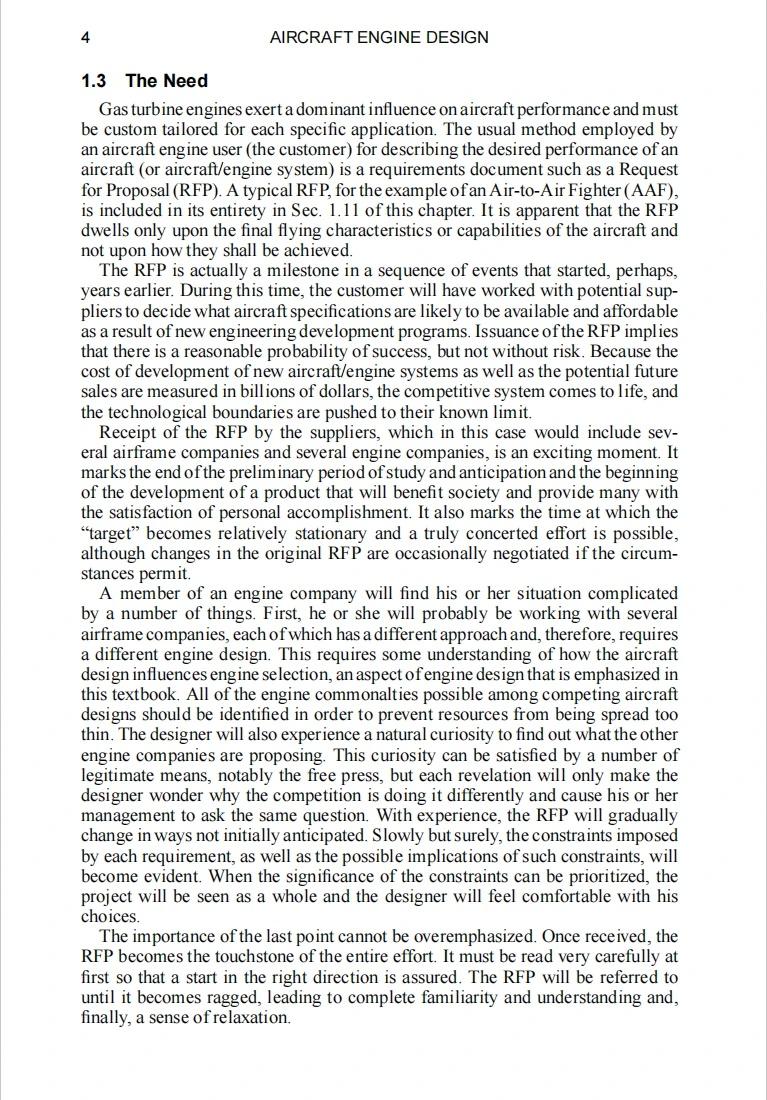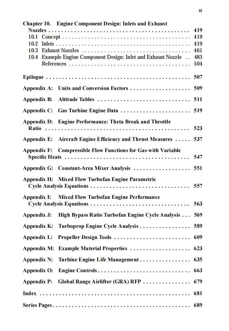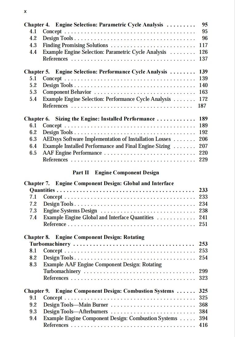 Aircraft Engine Design《飞机发动机设计》 呈现了一套完整且贴合实际的航空发动机设计实践流程。从新型飞行器的方案征询书(Request for Proposal,简称 RFP)到最终的发动机布局设计,涵盖了整个流程所需的核心概念与操作步骤。 着重强调了影响当前发动机设计的前沿发展方向,例如 θ 转折 / 油门比(theta break/throttle ratio)、寿命管理、控制系统以及隐身技术等。 设计流程的关键步骤被详细拆解至十个章节,内容涵盖:飞行器约束条件分析、飞行器任务剖面分析、发动机参数化(设计点)分析、发动机性能(非设计点)分析、发动机安装阻力与尺寸确定,以及进气道、风扇、压气机、主燃烧室、涡轮、加力燃烧室和排气喷管的专项设计。