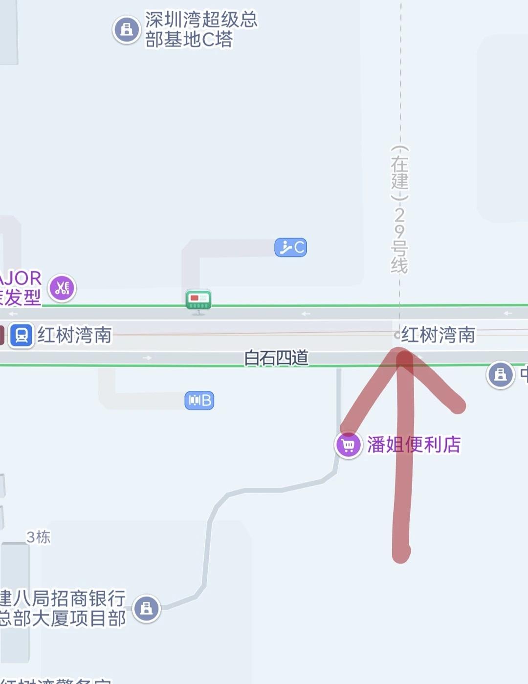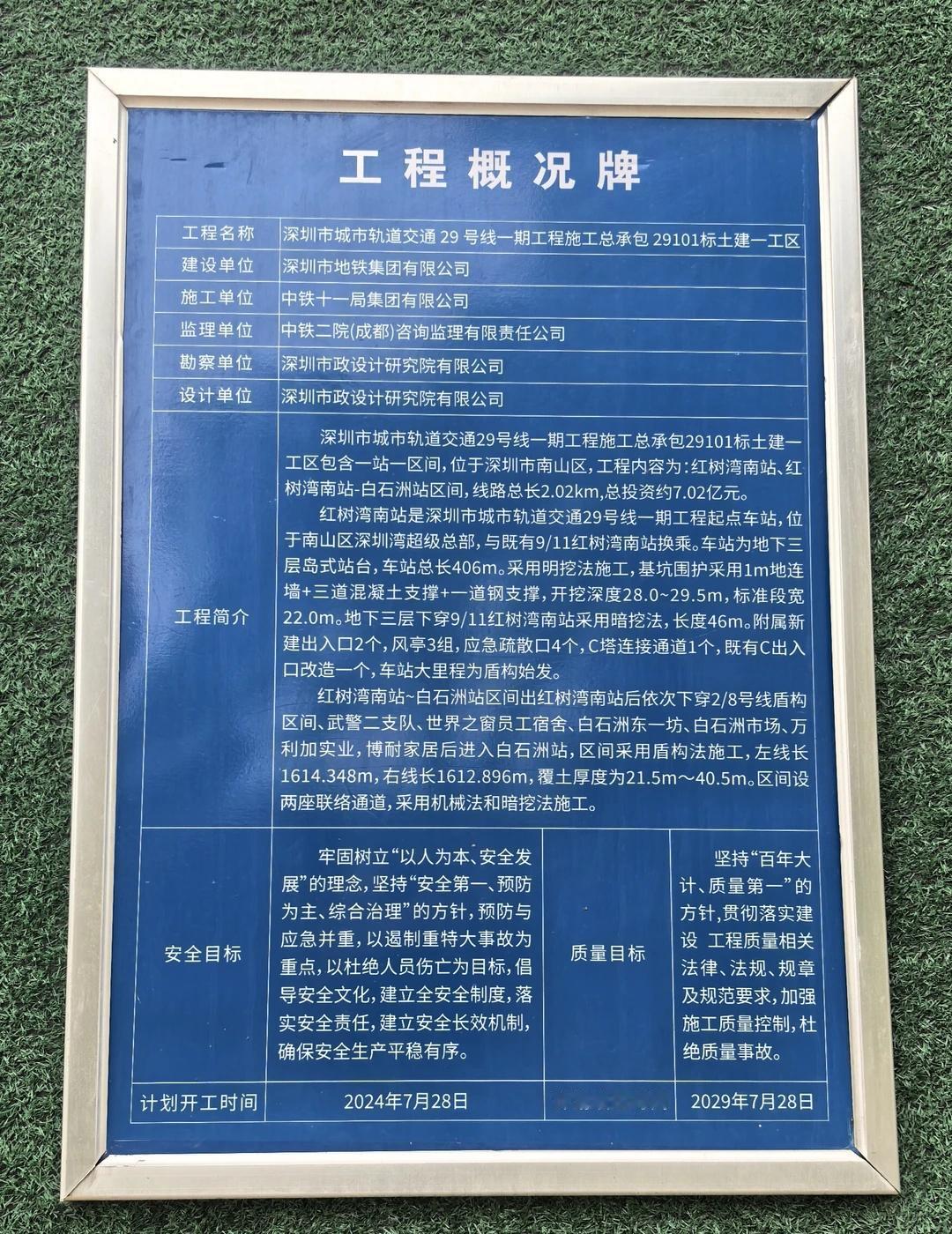 深圳地铁29号线红树湾南站~ 深圳地铁29号线红树湾南站是深圳地铁29号线一期工程起点车站,位于南山区深圳湾超级总部,与既有9/11红树湾南站换乘。车站为地下三层岛式站台,车站总长406m。采用明挖法施工,基坑围护采用1m地连墙+三道混凝土支撑+一道钢支撑,开挖深度28.0~29.5m,标准段宽22.0m。地下三层下穿9/11红树湾南站采用暗挖法,长度46m。附属新建出入口2个,风亭3组,应急疏散口4个,C塔连接通道1个,既有C出入口改造一个,车站大里程为盾构始发。深圳 深圳地铁