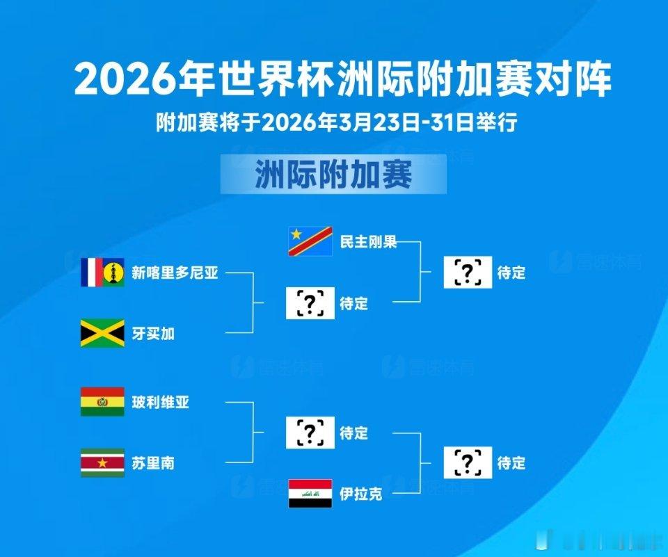今日,国际足联举行了2026世界杯洲际附加赛和欧洲区附加赛的抽签仪式。世界杯附加赛分为洲际附加赛和欧洲区附加赛,洲际附加赛为6队争夺2个名额,欧洲区附加赛为16队争夺4个名额。本次抽签仪式将先进行洲际附加赛抽签,再进行欧洲区附加赛抽签。首先被抽出的是种子队民主刚果,他们将进入第一半区,伊拉克落位第二半区。新喀里多尼亚成为了最先被抽出的非种子队,第二个被抽出的非种子队则是牙买加。两队的胜者将与民主刚果决出一个世界杯席位;而另外一组对决也已经决出,苏里南和玻利维亚的胜者将对阵伊拉克。世界杯洲际附加赛对阵新喀里多尼亚/牙买加vs民主刚果苏里南/玻利维亚vs伊拉克本届世界杯洲际附加赛为赛会制,将在3月23-31日于墨西哥进行。