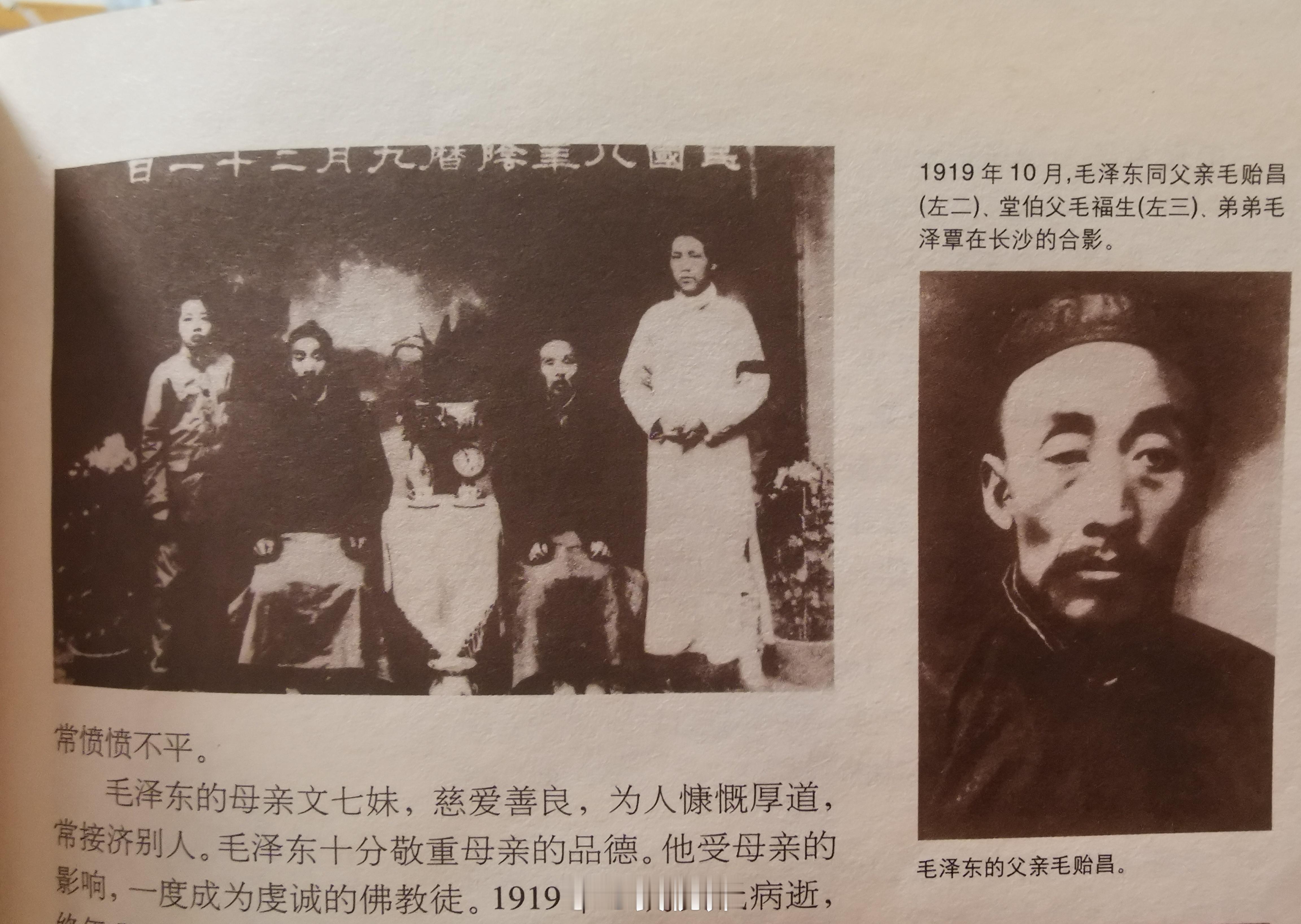 教员实际上是爱他父亲的!1919年10月5日,文七妹病逝,教员办完丧事后就返回长沙开展驱张运动。不久,他让堂伯父毛福生和弟弟泽 覃陪同父亲来长沙,一来给他治病(严重的伤寒),二来让他消除一些忧愁。在那么繁忙的情况下,他还带着父亲、堂伯父、泽 覃特意去照相馆拍了一张照片。三个月后,毛顺生病逝,终年50岁。