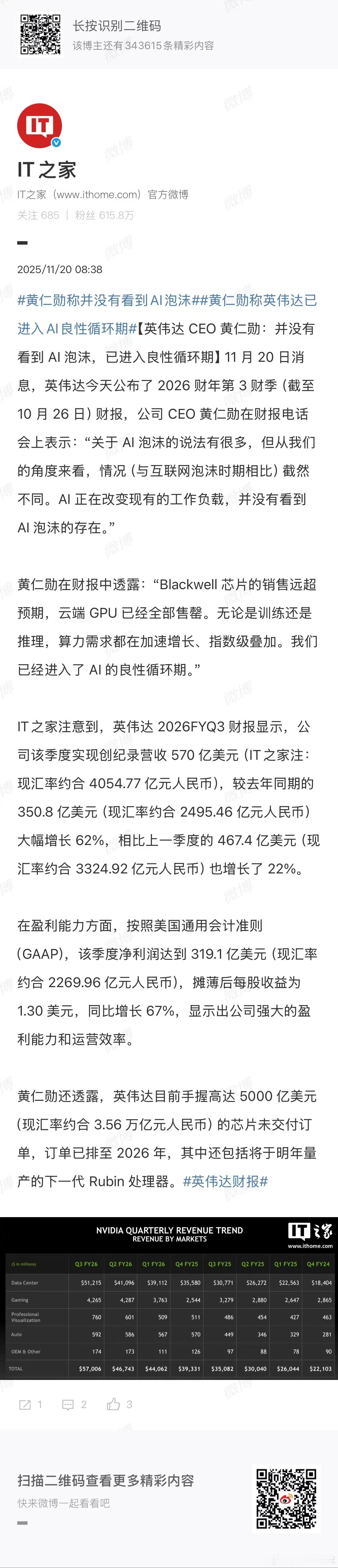 【 】AI泡沫这个词从去年一路吵到现在,今天英伟达黄仁勋在财报电话会上又给出了完全相反的判断,他认为AI并不存在泡沫,行业正走在良性循环里,算力需求还在继续拉升。可现实是只要AI出现风吹草动,泡沫讨论就会重新上来,有人担心增速太快,有人质疑投入太猛,也有人认为技术是长期价值,不必过度紧张。那么你认同不存在泡沫的说法吗?为什么泡沫会被反复提起?欢迎一起聊聊。(图IT之家)