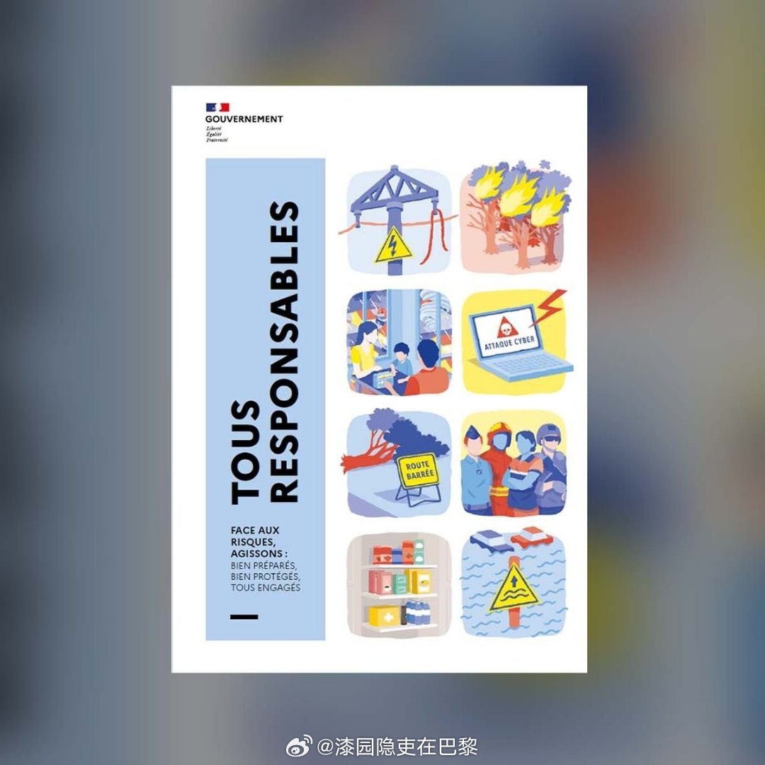 [ 🇫🇷 法国 ]🔸 法国总理府马提尼翁宫公布了其生存指南《人人有责》,旨在让法国人做好应对任何紧急情况的准备,无论是自然灾害、卫生危机,甚至是武装冲突。该手册由国防与国家安全总秘书处(SGDSN)编写,最初由让·卡斯泰于2021年发起。这份27页的指南借鉴了瑞典和芬兰的小册子,并根据法国面临的风险进行了调整。其目标是在不引发恐慌的情况下提供信息,涵盖各种重大危机,从洪水、能源黑障到大流行病,甚至可能的武装冲突。