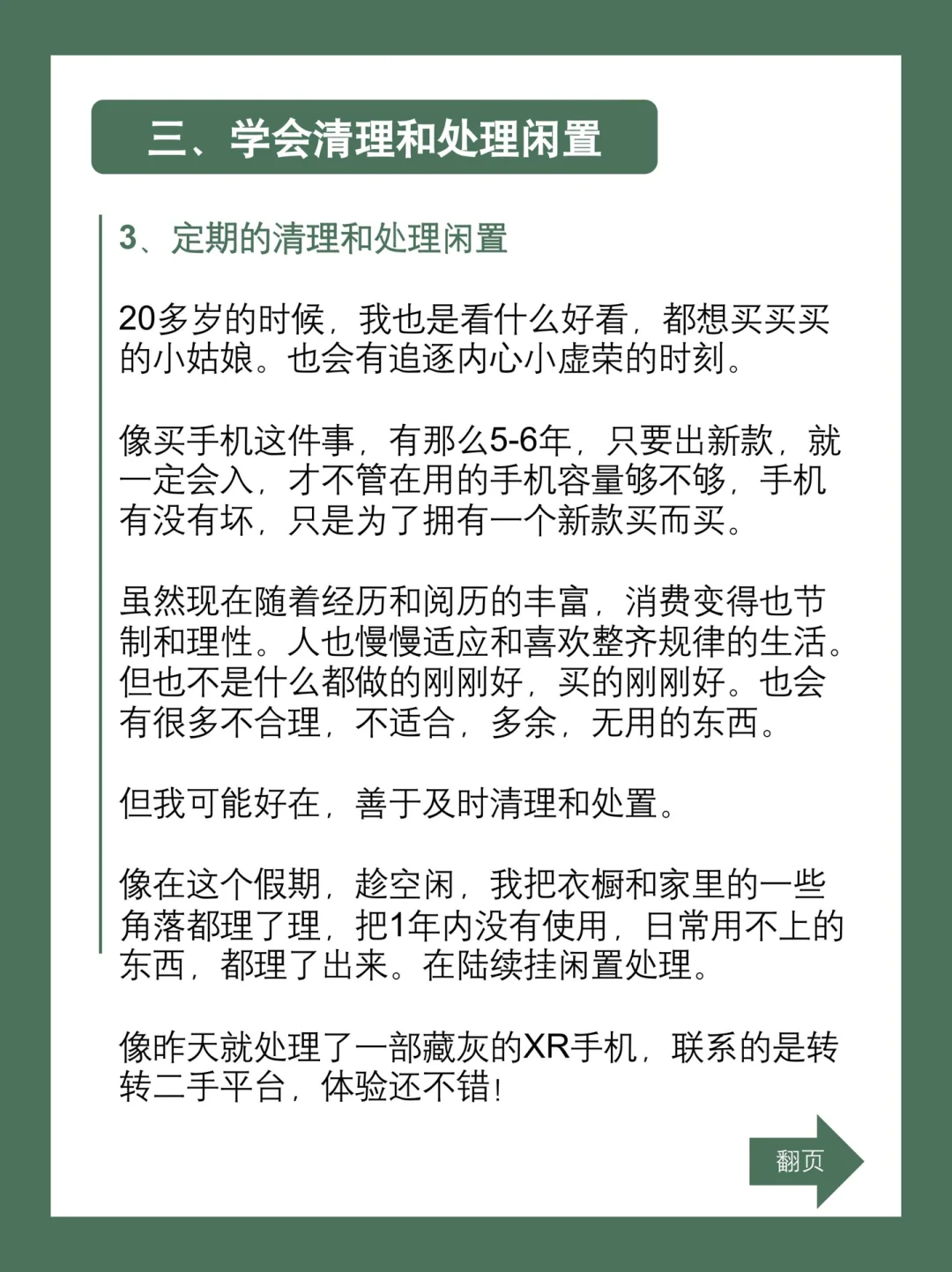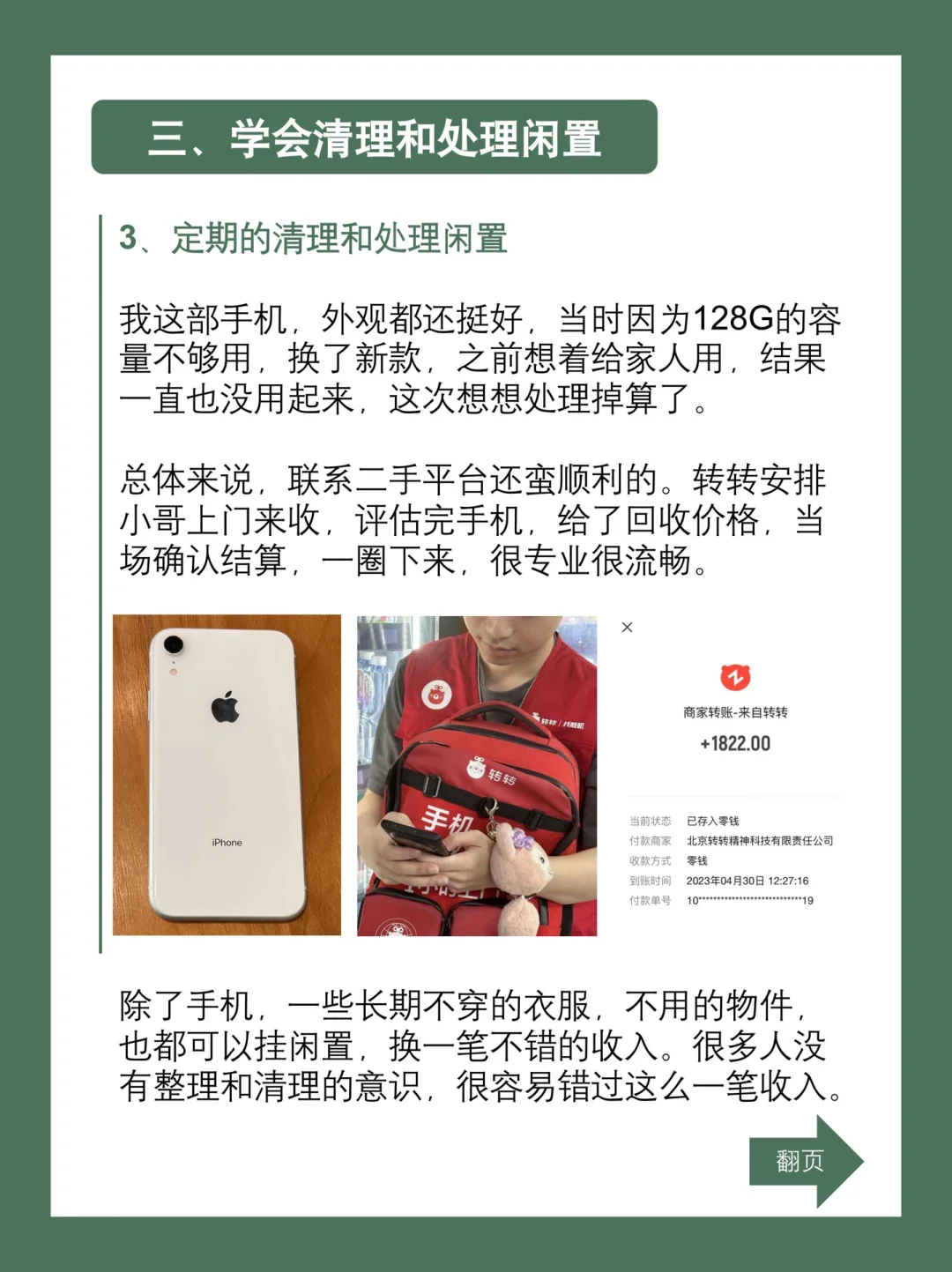 我提倡多多存钱,并不是反向提示不要花钱,而是希望先完成前面两个储蓄任务,再更有底气有质量的花钱,挣钱的意义也在于快乐的生活呀!我也经常会买到一些不太合适的东西,用着多余的东西。只是在这一点上,我会更重视定期做清理。把不适合的物件,长期不用的物件,及时清理和处置掉,有些挂二手平台,还能换回一笔笔不错的收入。像我昨天,就出了一台用不上的手机,联系的是转转回收平台,转转直接安排小哥上门来收,评估完手机,就能报价,双方达成一致成交,当场就给结算了。体验下来,还蛮专业,也蛮流畅的,感觉不错。