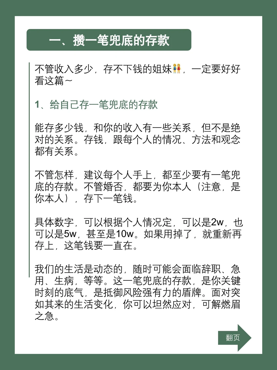 我们的生活是动态的,随时可能会面临辞职、急用、生病,……等等,不可控的情形。一笔兜底的存款,可以帮我们应对随时可能发生的生活变化,必要时解燃眉之急。不管婚否,建议姐妹们,都要为你本人(注意,是你本人)存下一笔兜底的钱。金额可以根据自己的情况定,可以是2w,也可以是5w,甚至10w。如果用掉了,就重新再存上,这笔钱要一直在。它是你关键时刻的底气,也是你抵御风险强有力的盾牌。