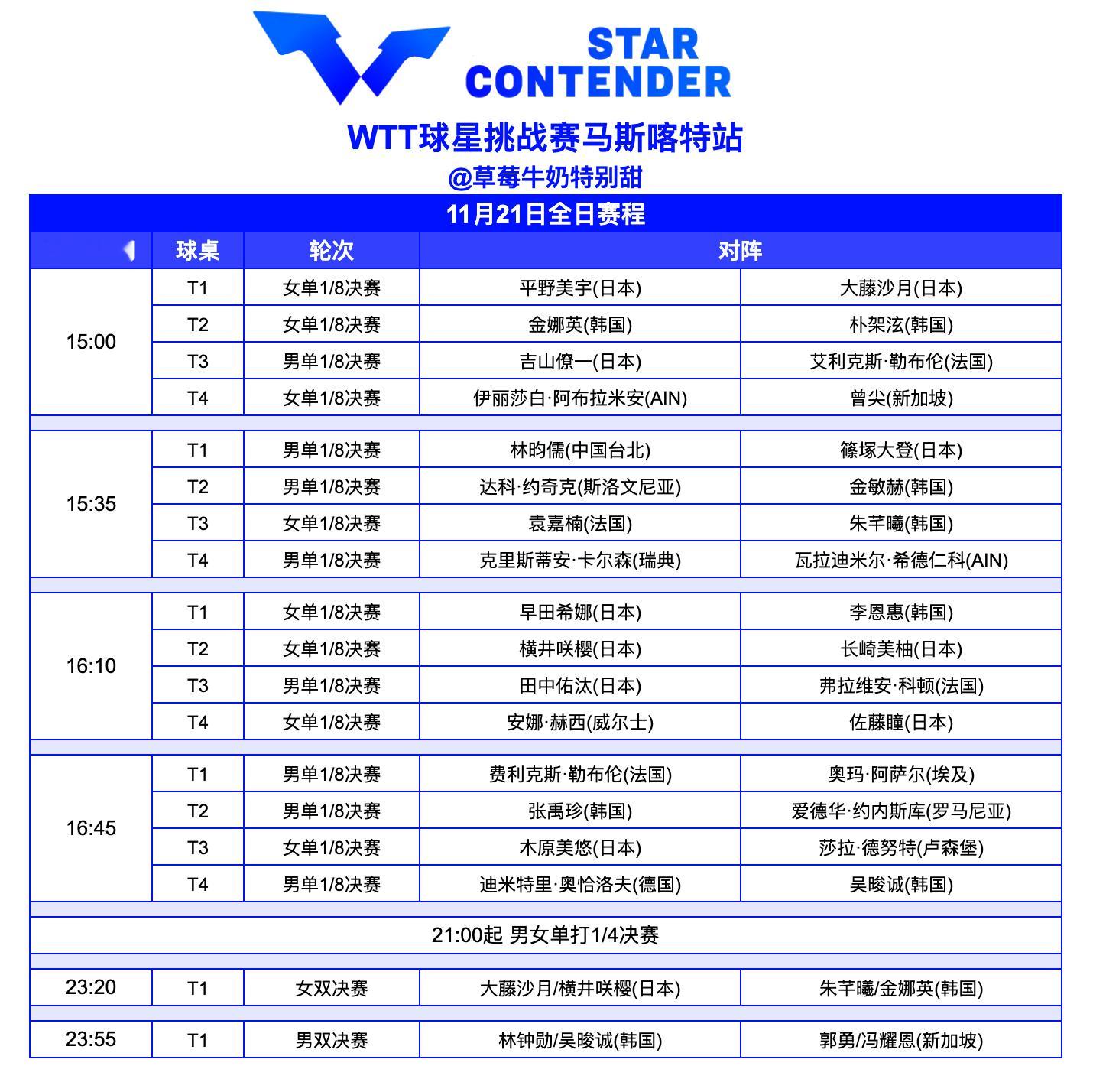 WTT球星挑战赛马斯喀特站丨11月21日全日赛程今日还将进行男女单打1/4决赛