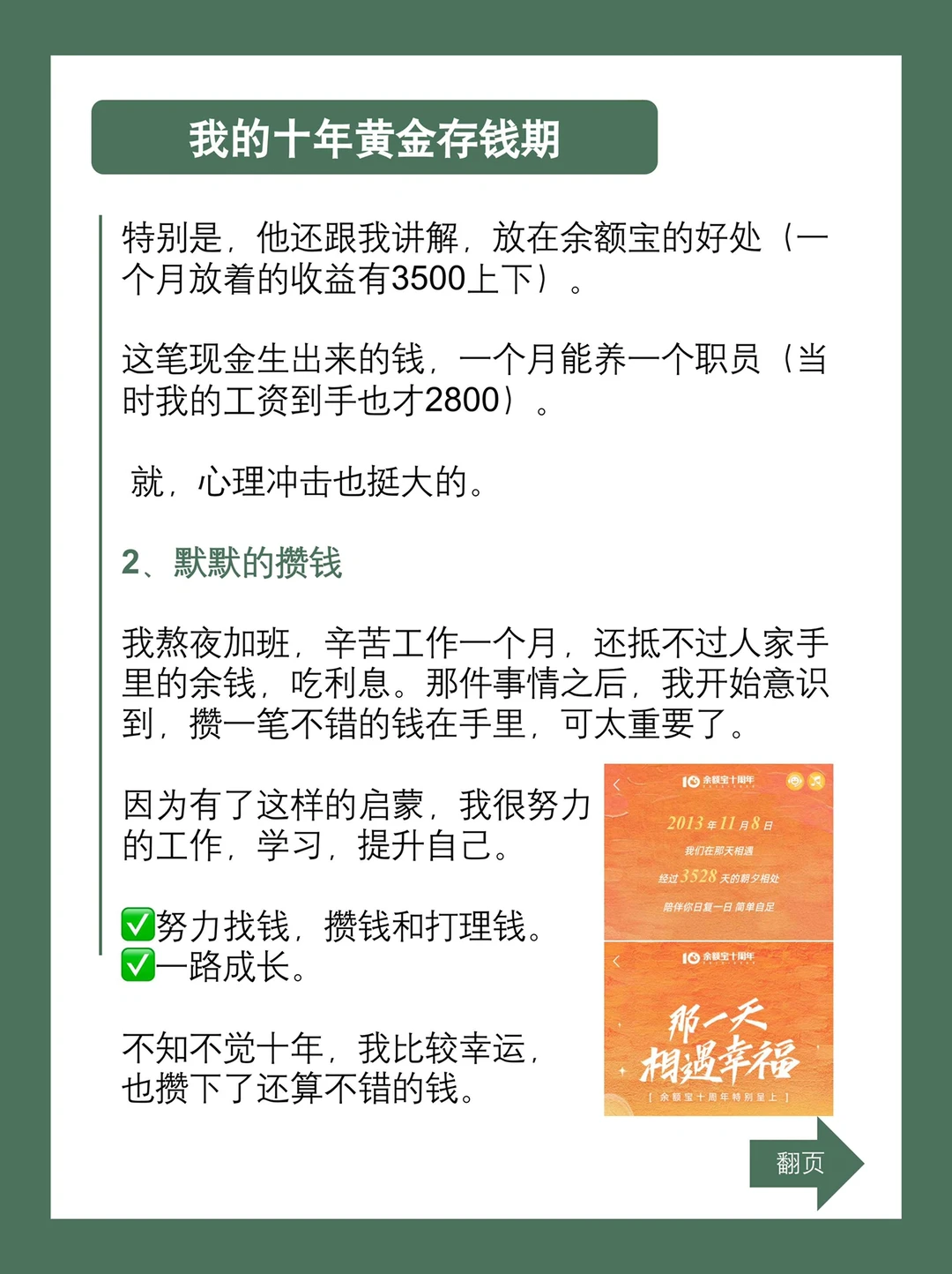 刚参加工作那会儿,我对存钱也没有概念。那个时候,家里条件不好,父母辛劳,一年到头赚的钱,都供不起我上大学。刚工作发的工资也基本上是贴补家里,把读大学家里欠的钱先还上,手里也没有结余。直到2013年年中,偶然的一次,跟当时工作中要对接的一个合作商聊天,他跟我提起公司的现金储备(为了聊D货的折扣,展示实力),直接把他放在余额宝的100+w摆给我看。对当时我这个小职员来说,视觉冲击挺大的。特别是,他还跟我讲他放在余额宝的好处(一个月收益有3500上下),这笔现金生出来的钱,一个月能养一个职员(当时我的工资到手也才2800)。就,心理冲击也挺大的。