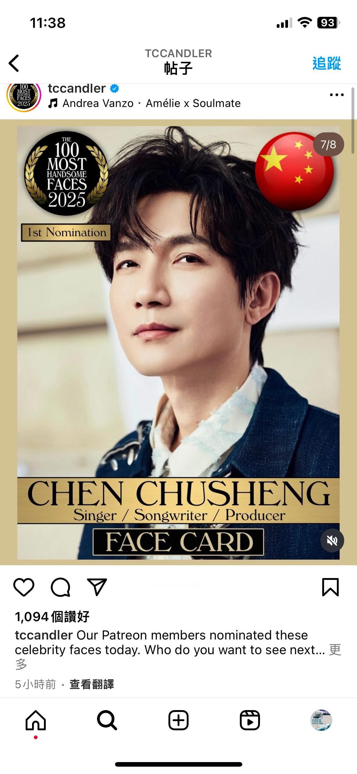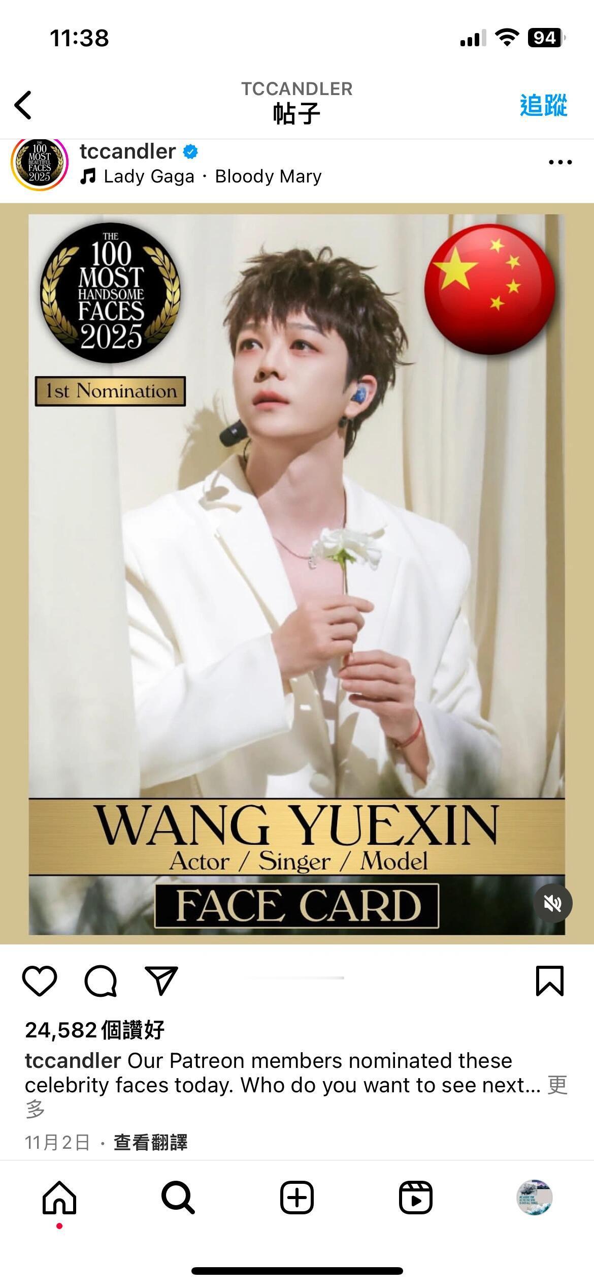 陈楚生 王栎鑫入围TC Candler《全球百大最帅面孔》