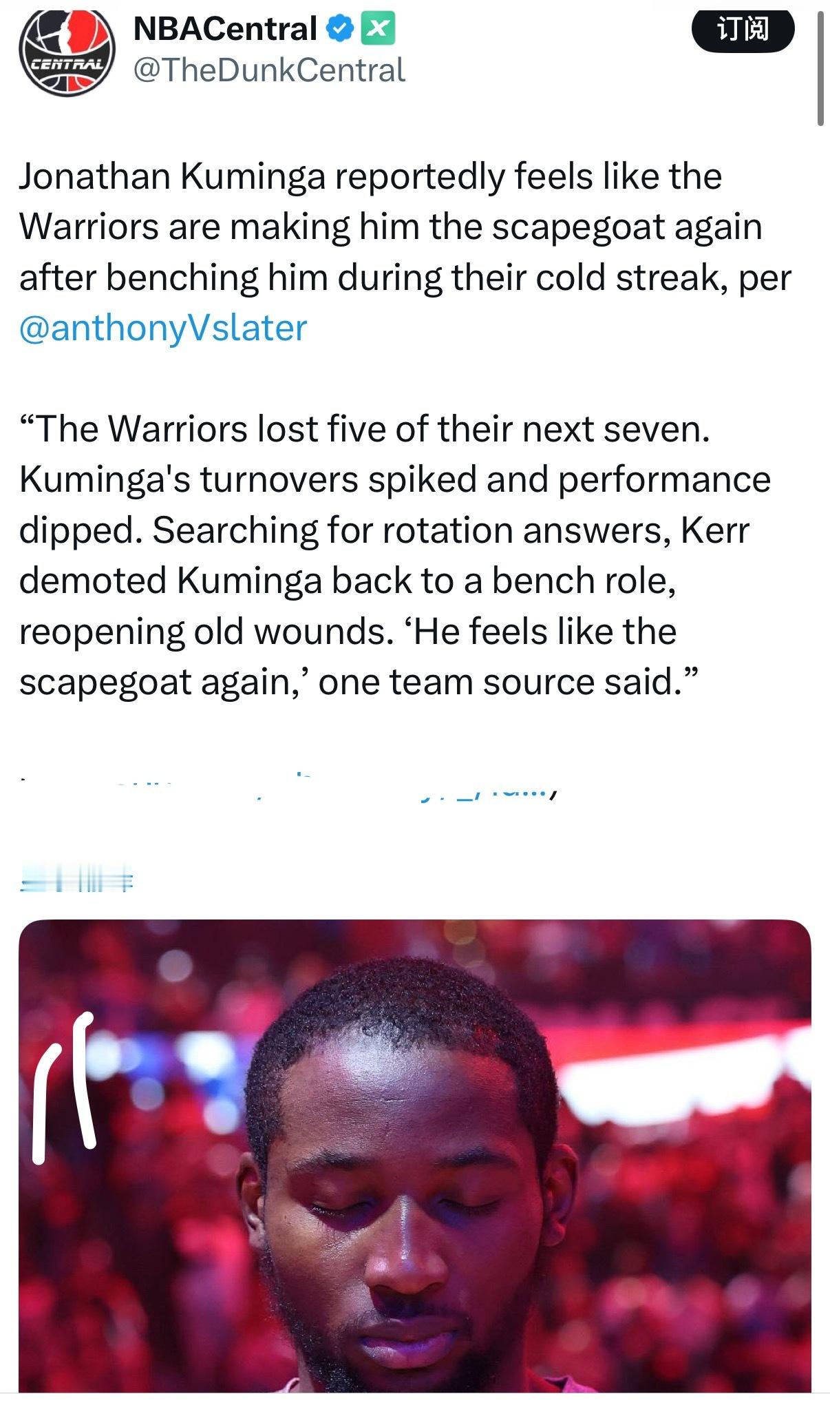 anthonyVslater :库明加觉得在勇士这段低迷时期被再次当成“替罪羊”,因为他被按到替补席。“勇士在过去的七场比赛里输了五场。库明加的失误增加,表现下滑。科尔在寻找轮换答案时,又把库明加降回替补位置,再次揭开旧伤疤。‘他觉得自己又成了替罪羊,’一位球队消息人士说道。”
