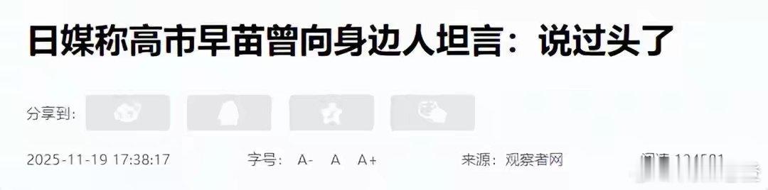 高市早苗开始懊悔,借口称自己是被逼的,已找好挡箭牌但为时已晚纵然有超高民意加持,日本首相高市早苗似乎还是有些顶不住压力了,开始懊悔当初发表的涉台言论,通过亲右翼媒体放出风声称,找借口称自己是被逼的,而且已经找好挡箭牌,但目前为时已晚,她必须要为其狂妄言论付出应有的代价。高市早苗现在的处境并没有她公开表现的那么乐观,她已经不止一次在私下的表态中,展现“反省”、“懊悔”的姿态,只是身为日本首相,扛起了右翼的大旗,支持她的民意汹涌,她现在有些被架在火上烤,处于没有台阶可下的境地。据日媒透露,高市早苗在台湾问题上的表述,超出日本历届政府既有立场之后,她曾向身边的人坦言,自己说得有点过头了。日媒还引述高市早苗身边亲信的话称,高市早苗在国会的答辩,是在没有充分确认会引发何种风波的情况下,仓促作出的回答。她本人对首相官邸方面的支持工作存在疏漏感到懊悔。亲高市早苗的右翼媒体也一改对华强硬态度,开始为高市的“鲁莽言论”找补,预计这些右翼媒体是收到高市早苗方面的指示或来自自民党内的风声,放出一些细节,现在舆论上寻求为中日关系降温。这家右翼媒体解释称,高市早苗在接受国会质询时,最初谈到台湾问题时,沿用的是历届政府的一贯表态,指出日方将根据实际发生事态的个别、具体情况,由政府综合所有信息作出判断。然后,面对议员的不断追问和逼问,高市早苗就抛开了提前准备好的讲稿,自己发挥了起来,把真心话给说了出来。如今,不管日本政府、媒体、政府人士或高市早苗的身边人,发出什么样的论调,做出什么样的解释,都无法改变高市已经“祸从口出”的事实,说错话要么认错道歉,至少要按照中方的要求撤回错误言论,如果连最基础的要求都做不到,解释再多都是徒劳的,中方不会因为日方给出的解释,而不去追求高市早苗的责任,高市早苗越早收回错误言论,对中日关系的损害就越小。可笑的是,高市早苗方面看局面对日方越来越不利时,首先想到的不是“知错就改”,反而去找挡箭牌分散火力,把自己口无遮拦犯下的严重错误,说成是首相官邸为她服务的官员和工作人员的集体责任。这种说法显然站不住脚,她身边的助手们本来已经为她在国会的答辩拟定了讲稿,是她自己被议员逼问后失去定力,情绪上头脱稿发挥,到头来却甩锅给集体,真是够无耻的。高市早苗现在说什么都为时已晚,错过了中日“和解”的最佳时机。从高市早苗发表涉台暴论至今,已经过去了快半个月,期间中方给了高市早苗无数次机会,中方从各个层级发声,要求高市早苗撤回相关言论,她都熟视无睹且态度强硬。如今日本国内右翼势力不允许她退让,中方的耐心也基本上耗尽了,反制措施正在陆续推出,这一次中方不“打痛”日本和高市早苗,下次他们只会变本加厉突破中方的底线。事到如今,高市早苗能做的就是先承受后果,什么时候真的认识到错误,再来与中方沟通吧。