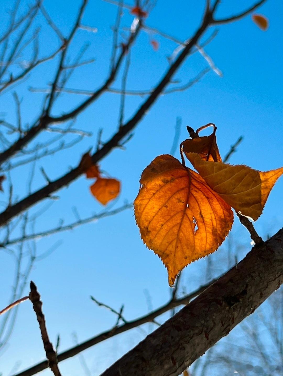 冬天的叶子,已经干枯,在寒风中瑟瑟抖动着,大朵的阳光照过来,给叶子涂上了暖色,变得灵动而柔美起来。