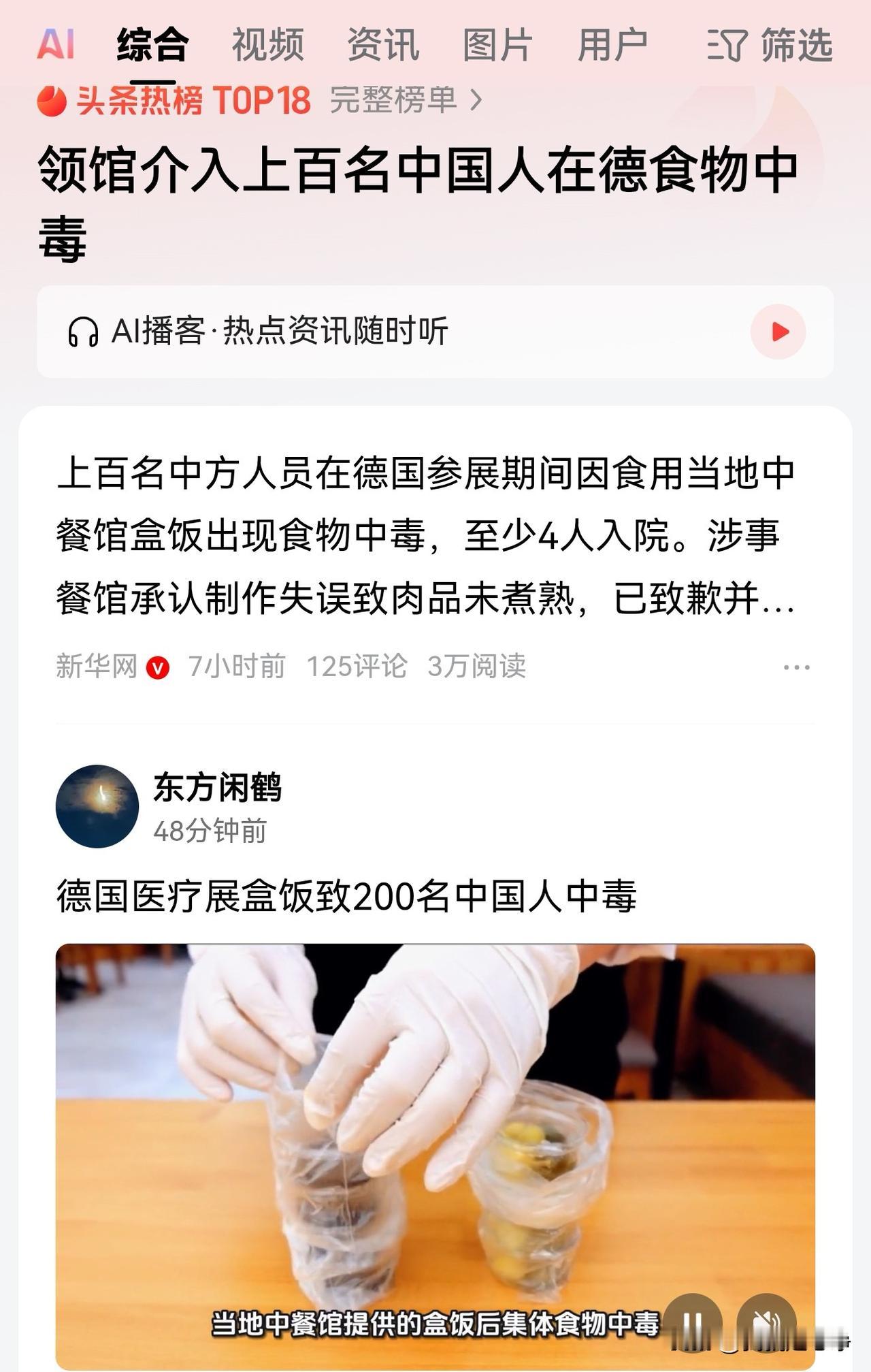 真的只是普通的食物中毒吗?不会是人为投毒吧! 现在海外仇恨中国的人越来越多了。 西方持续的反华洗脑宣传已经起到了一定的作用。 不排除有人故意投毒啊。 就算不是投一些剧毒物品,在烹饪过程中做点手脚,故意做不熟,故意污染食材。 这种可能性也是有的。 大家千万不要忘了德国现在跟台独分子眉来眼去走的是很亲近的。 沈伯洋前一段时间就跑到德国去上窜下跳。 德国朝野现在的风气非常不对。 出门在外的国人一定要小心保护好自己。 未来国际冲突会越来越多的。 仇恨中国的民族和国家也会越来越多的。 战争都是不可避免的选项了,更不要说下阴招了。