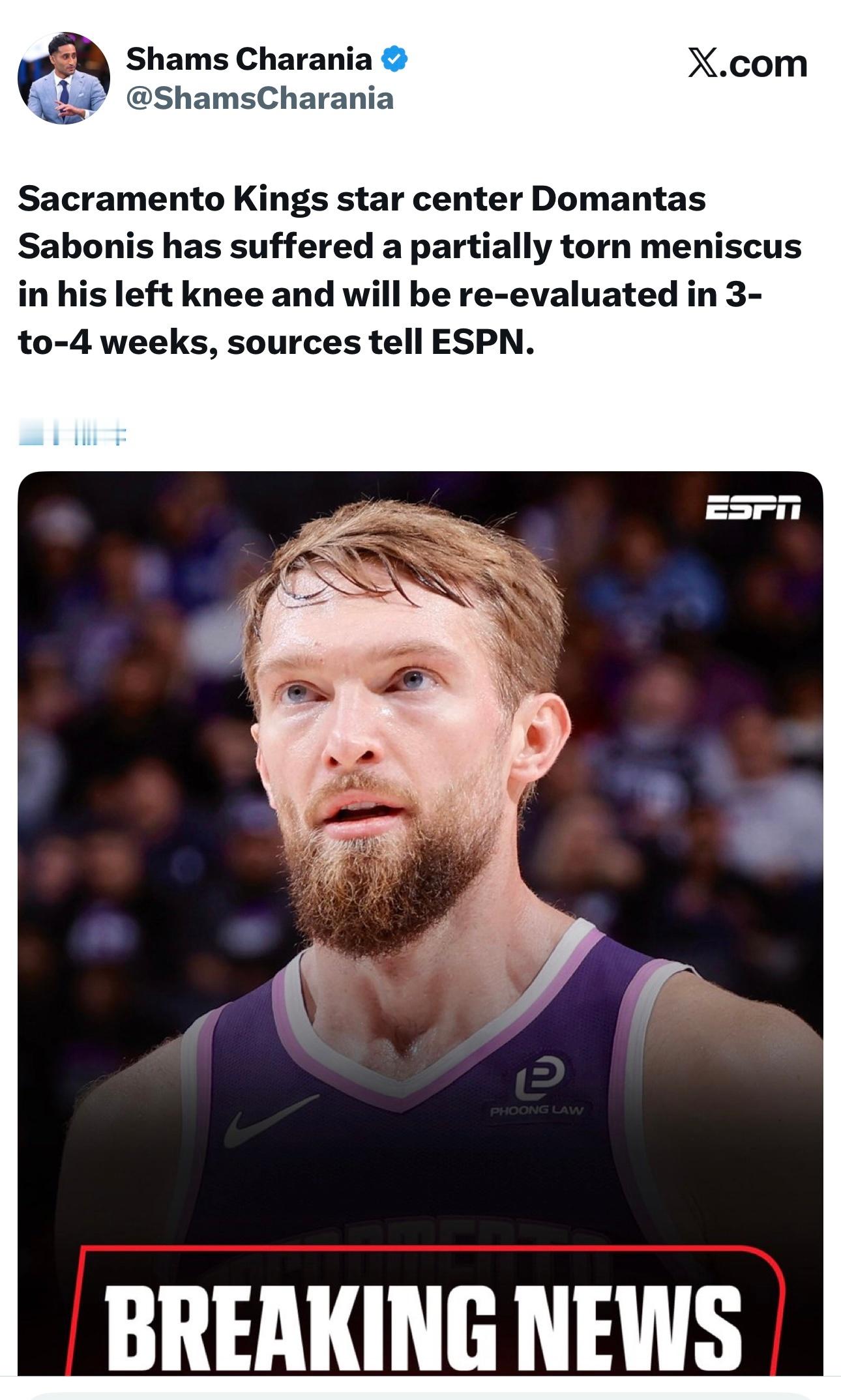 Shams:萨博尼斯左膝半月板部分撕裂,3-4周后复查。