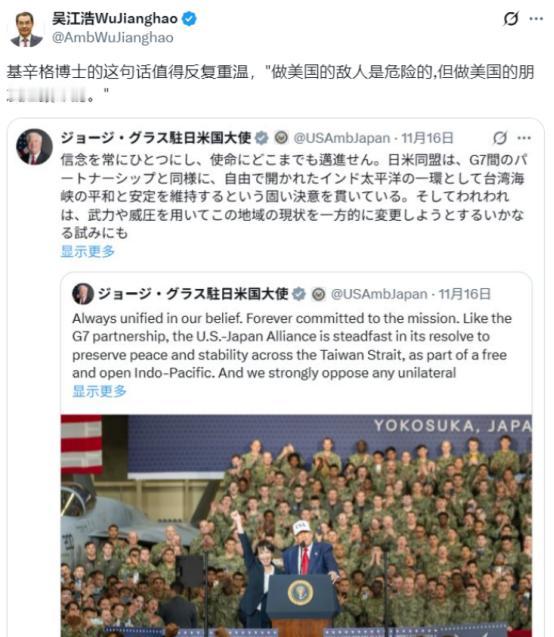 中国驻日大使吴江浩嘲讽美国驻日大使:格拉斯大使真那么轻松吗?全世界都在感谢来自你的国家的“关税”,做美国的盟友真是“幸运”。 同时,吴江浩引用基辛格的的话:基辛格博士的这句话值得反复重温,“做美国的敌人是危险的,但做美国的朋友是致命的。”   你看美国这些年来,打着“美国优先”的旗号,对盟友那是说加关税就加关税,完全不顾及盟友的感受。   就说日本吧,作为美国在亚洲的重要盟友,也没少挨美国的“关税大棒”。美国觉得日本在某些产业上威胁到了自己的利益,二话不说,直接加征关税,搞得日本企业苦不堪言。日本政府虽然心里不满,但表面上还得陪着笑脸,毕竟美国是老大,得罪不起。   可这种所谓的“盟友关系”,真的是平等的吗?显然不是。美国把盟友当成可以利用的工具,需要的时候拉拢一下,不需要的时候就一脚踢开。   就像这次格拉斯挺日本,表面上看是支持日本,实际上不过是美国为了维护自己在亚洲的利益,利用日本来制衡中国罢了。   日本还以为抱上了美国的大腿,就能在国际上耀武扬威,结果呢?不过是美国棋盘上的一颗棋子,随时可能被牺牲掉。   吴江浩大使还引用了基辛格的一句话:“做美国的敌人是危险的,但做美国的朋友是致命的。”这句话可真是说到点子上了。   基辛格是谁?那可是美国前国务卿,在国际政治舞台上摸爬滚打了几十年,对美国的对外政策有着深刻的理解。他这话可不是危言耸听,而是有事实依据的。   先说说做美国的敌人有多危险。美国作为全球唯一的超级大国,军事实力那是没得说,经济实力也是遥遥领先。   谁要是敢跟美国对着干,那美国肯定会想尽办法打压你。就拿伊朗来说吧,美国一直把伊朗视为眼中钉,肉中刺,对伊朗实施了各种制裁,从经济到军事,全方位打压。伊朗虽然也有,但在美国的强大压力下,日子也不好过。   经济上,伊朗的石油出口受到严重限制,国内经济陷入困境;军事上,美国时不时在伊朗周边搞军事演习,威胁伊朗的安全。伊朗为了应对美国的压力,不得不投入大量资源来发展军事力量,但这又进一步加剧了与美国的矛盾,形成了一个恶性循环。   再看看做美国的朋友有多致命。前面说了,美国把盟友当成工具,需要的时候利用,不需要的时候就抛弃。   就拿英国来说吧,英国曾经是美国的铁杆盟友,在很多国际事务上都跟着美国亦步亦趋。但英国跟着美国也没得到什么好处,反而吃了不少亏。   就说伊拉克战争吧,英国为了支持美国,派兵参加了伊拉克战争,结果呢?战争结束后,伊拉克陷入了混乱,英国在伊拉克的投入打了水漂,还惹了一身骚。   国内民众对政府的不满情绪高涨,政府的支持率直线下降。而且,英国跟着美国在国际上树敌不少,对自己的国际形象也造成了负面影响。   还有法国,法国也是美国的盟友,但在一些问题上,法国也有自己的想法,不想完全跟着美国走。   结果美国就不高兴了,对法国进行各种打压。就拿澳大利亚潜艇订单事件来说吧,法国本来和澳大利亚签好了潜艇订单,结果美国为了拉拢澳大利亚,横插一杠子,把订单抢走了。   这让法国非常愤怒,但也无可奈何。法国虽然是欧洲大国,但在美国面前,还是显得有些弱小,只能吃这个哑巴亏。   回到日本身上,日本现在跟美国走得这么近,真的能得到好处吗?表面上看,日本在美国的支持下,在国际上的地位有所提升,但实际上,日本付出的代价也不小。   日本为了配合美国的战略,不得不增加军费开支,加强军事力量,这无疑会加剧地区的紧张局势。而且,日本在经济上也受到了美国的影响,美国的经济政策一旦调整,日本的经济就会受到冲击。就像美国加征关税一样,日本的企业首当其冲,利润下降,甚至有些企业不得不裁员、倒闭。   所以说,吴江浩大使嘲讽格拉斯的话,那是一针见血。美国所谓的“盟友关系”,不过是一种利益交换,美国只考虑自己的利益,根本不会真正关心盟友的死活。日本如果继续跟着美国走,继续充当美国的马前卒,最终只会落得个被利用、被抛弃的下场。