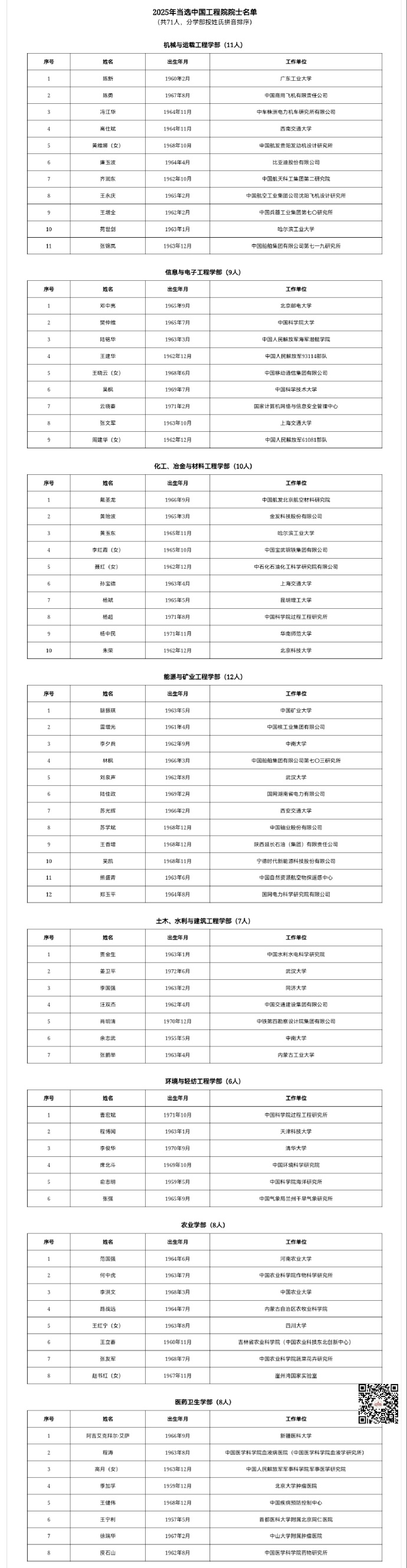 【 】中国科学院、中国工程院11月21日公布2025年院士增选结果,分别选举产生中国科学院院士73人,中国工程院院士71人。其中,中国商飞的工程总师陈勇、比亚迪首席科学家廉玉波、宁德时代的首席科学家吴凯、宝武钢铁的首席科学家李红霞入选工程院院士。
