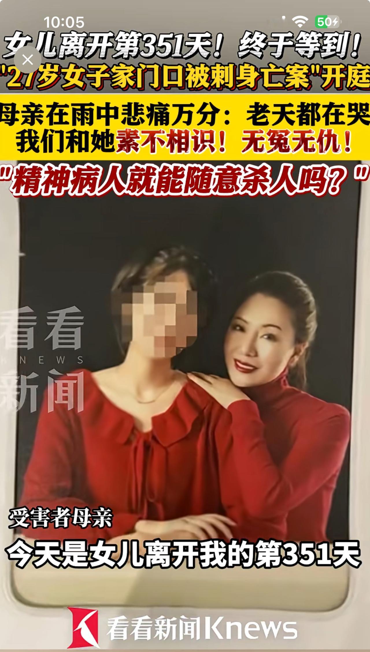 这位母亲太惨了,女儿在家门口遇害520余天,凶手却在昨日庭审中换律师拖延审判,企图苟活。 凶手每多活一天,对被害家庭来说就是度日如年。 这位母亲在丈夫早逝的情况下,独自抚养女儿长大。被害女子王某雅27岁,北外毕业,留学日本,从事自媒体工作,履历非常漂亮,没想到红颜薄命。一个幸福的家庭就这样毁了。 据网上消息报道,作案女人梁某某,2023年8月起就多次在小区内无故敲门辱骂住户和警察,随身携带道具滋扰住户。因拒不配合调查,受到警方警告!对这种具有极高风险犯罪的人物没有采取进一步措施,非常遗憾。 2023年12月该女子就去被害人家敲门,2024年6月9日携带刀具前往被害人家敲门并吐口水,引被害人开门后冲入家中行凶。 后来法医鉴定,被害人胸部面部中十刀,下手非常凶残,刀刀致命。事发时,物业派了一名65岁老保安来处理。我估计突发情况,这老保安都需要别人保护。 打斗中,凶手鼻梁被打骨折,然后自驾车去医院就医,其父母以“精神病”为由申请免责。看到没有,凶手还想以精神病为挡箭牌求生。 经司法鉴定,梁某某被确诊为精神分裂症患者,其作案行为被认定为“部分刑事责任能力”。 既然是精神病为什么不做好日常监护?事发后才想起用精神病减轻刑责?别人的命难道就不是命吗? 我支持对这个女人死刑!你们怎么看?