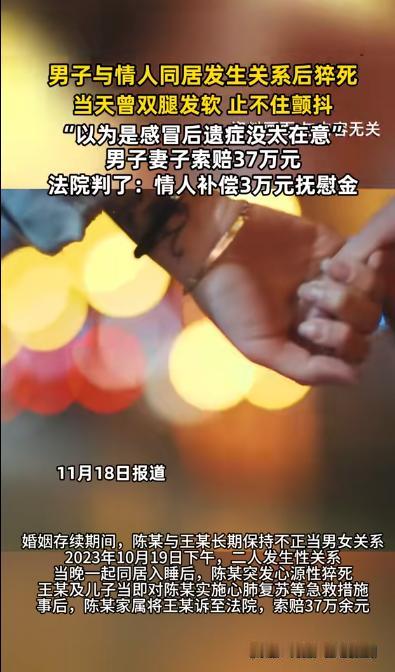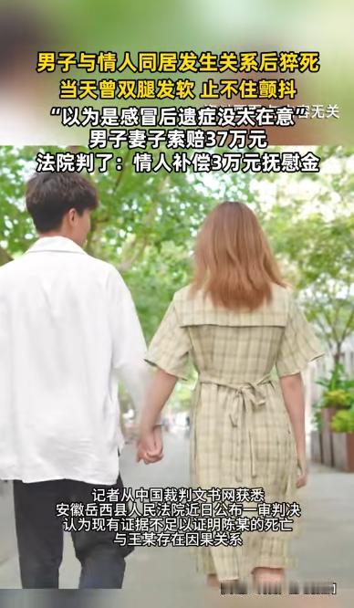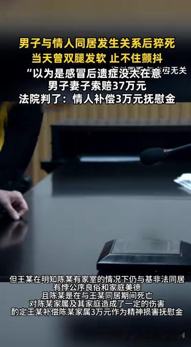 “太离谱了!”安徽一男子婚内出轨,感冒发烧期间仍与情人在出租屋保持亲密。完事后男子双腿发软、止不住颤抖,却误以为是感冒后遗症。不料当晚突发意外,情人发现后紧急施救却回天乏术。男子的家属一气之下把情人告上法庭,索要37万的赔偿,法院判决亮了! 谁能想到,一场婚外情,最后竟以人命收场,还牵扯出这么多争议。 郑先生(化名)和妻子结婚多年,有了孩子,可两人感情早就淡了,后来他认识了小美(化名),偷偷跟人好上了,成了地下情人。 前段时间,郑先生感冒了,还发着烧,按理说该好好在家休息,可他还是约了小美见面,去了出租屋,两人像往常一样发生了亲密关系,可没过多久,郑先生就觉得不对劲。 他说自己腿软,还一个劲地发抖,当时没当回事,以为就是感冒没好利索,可情况越来越糟,到后来腿都快动不了了,身上还出现其他不舒服的症状。 小美慌了,赶紧想办法急救,可还是晚了,郑先生没救过来,当场没了气。 消息传到郑先生妻子耳朵里,她又气又痛,丈夫不仅婚内出轨,还在生病的时候跟情人约会,最后落得这个下场,她觉得这一切都是小美造成的,直接把人告上了法院,要求赔偿三十七万,里面有精神损失费,还有家里少了顶梁柱的经济损失。 后来有人觉得,小美破坏别人家庭,还间接导致郑先生死亡,赔 37 万都算少的,也有人说,郑先生自己要出轨,还在生病时折腾,主要责任在他自己。 直到法院判决下来,所有人都没想到,小美只需要赔 3 万多。 法院说,郑先生选择婚外情,还在感冒时跟小美见面,都是他自己的决定,小美虽然有责任,但不是导致郑先生死亡的直接原因,赔偿得按实际情况来定,不能全听家属的要求。 判决结果一出来,网上更热闹了,有网友替郑先生妻子抱不平,37 万降到 3 万,这落差也太大了,她心里肯定不好受。 也有网友支持法院的判决,郑先生自己不负责在先,不能把所有错都推给小美,3 万多虽然不多,但也算是让小美为自己的行为付出了代价。 现在案子结了,小美赔了钱,可郑先生的妻子和孩子,还得带着伤痛继续生活,好好的一个家,就因为郑先生的一时糊涂,全毁了。 婚姻里最重要的就是忠诚和责任,一旦踏错一步,可能就会酿成无法挽回的悲剧。 对此,你还有什么看法呢? (信息来源 :观象视频 )