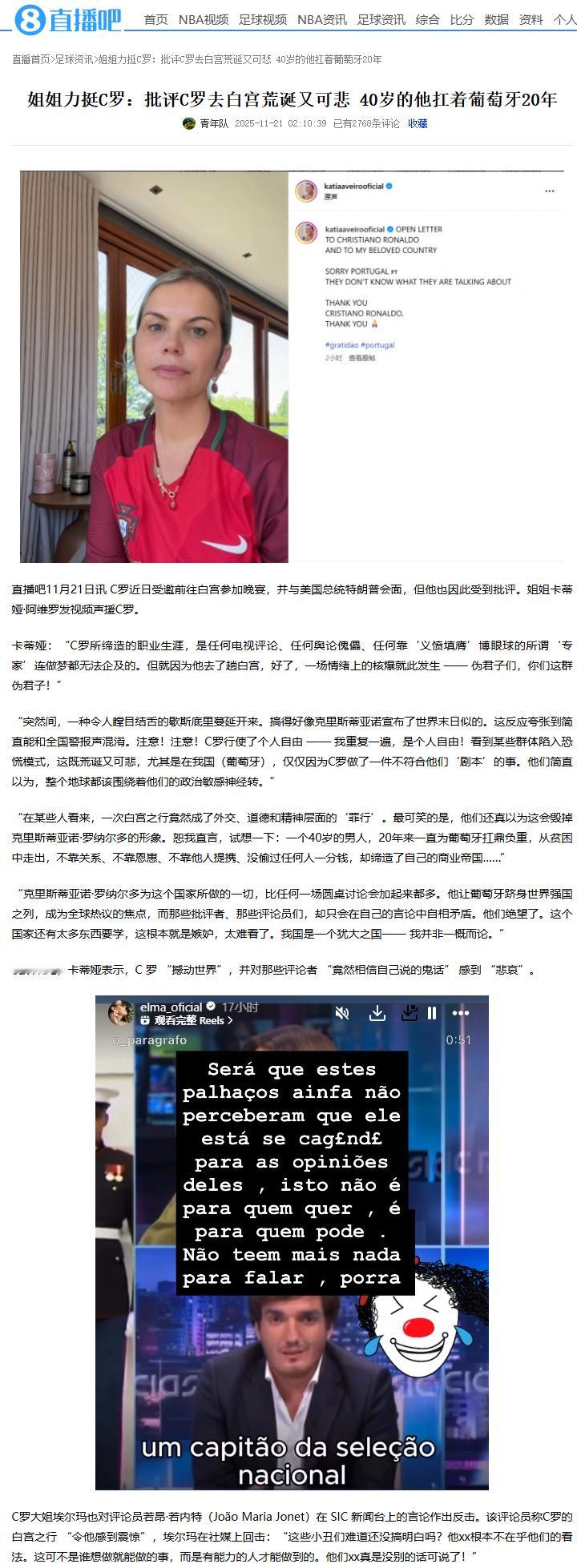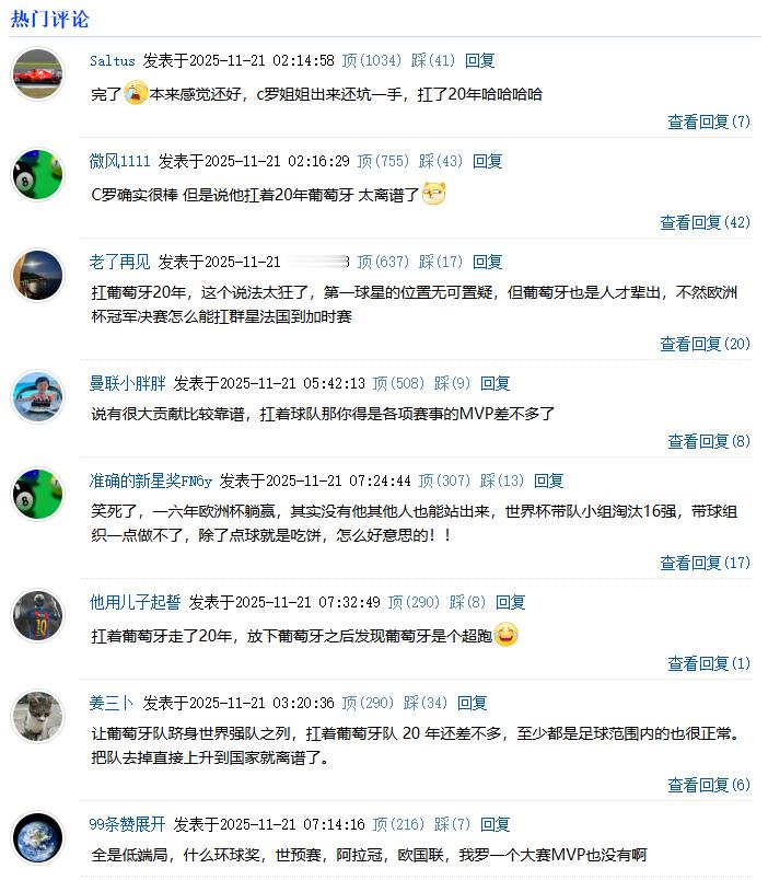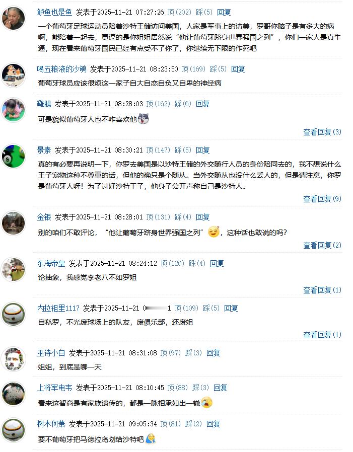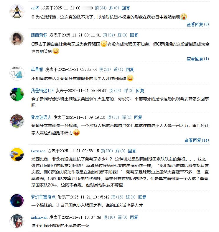C罗姐姐看完评论区也破防了,回应说40岁的C罗扛着葡萄牙20年,他让葡萄牙跻身世界强国之列,批评葡萄牙是一个犹大之国。直播吧热评:扛着葡萄牙走了20年,放下葡萄牙之后发现葡萄牙是个超跑论抽象,我感觉李老八不如罗姐看了新闻好像沙特王储是去美国谈军火生意的,你说你一个葡萄牙的足球运动员跟着去算怎么回事呢作为总裁球迷,这次真的洗不动了,以前对抗资本权贵的形象在我心目中轰然崩塌