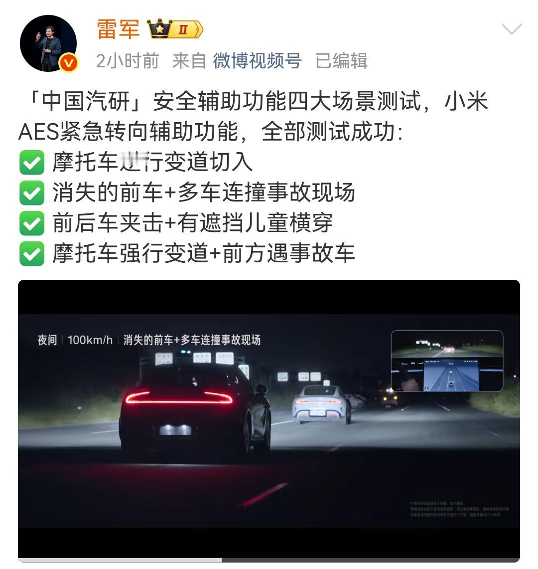 雷军:「中国汽研」安全辅助功能四大场景测试,小米AES紧急转向辅助功能,全部测试成功! ✅ 摩托车逆行变道切入 ✅ 消失的前车+多车连撞事故现场 ✅ 前后车夹击+有遮挡儿童横穿 ✅ 摩托车强行变道+前方遇事故车 小米关于车辆智能驾驶方面终于不再保守了,此前的设计偏保守,在遇到前方有危险的时候,做出的第一反应就是减速,这样还是有碰撞风险的情况。 此次的重大优化升级,就是依据我国道路的实际情况进行的动态调整,让车辆能够自主应对以上这4种情况,目前这4种情况能够覆盖大部分应用场景,还有的应用场景小米也在逐步的进行优化。 各位是怎么看的?欢迎评论区留言。