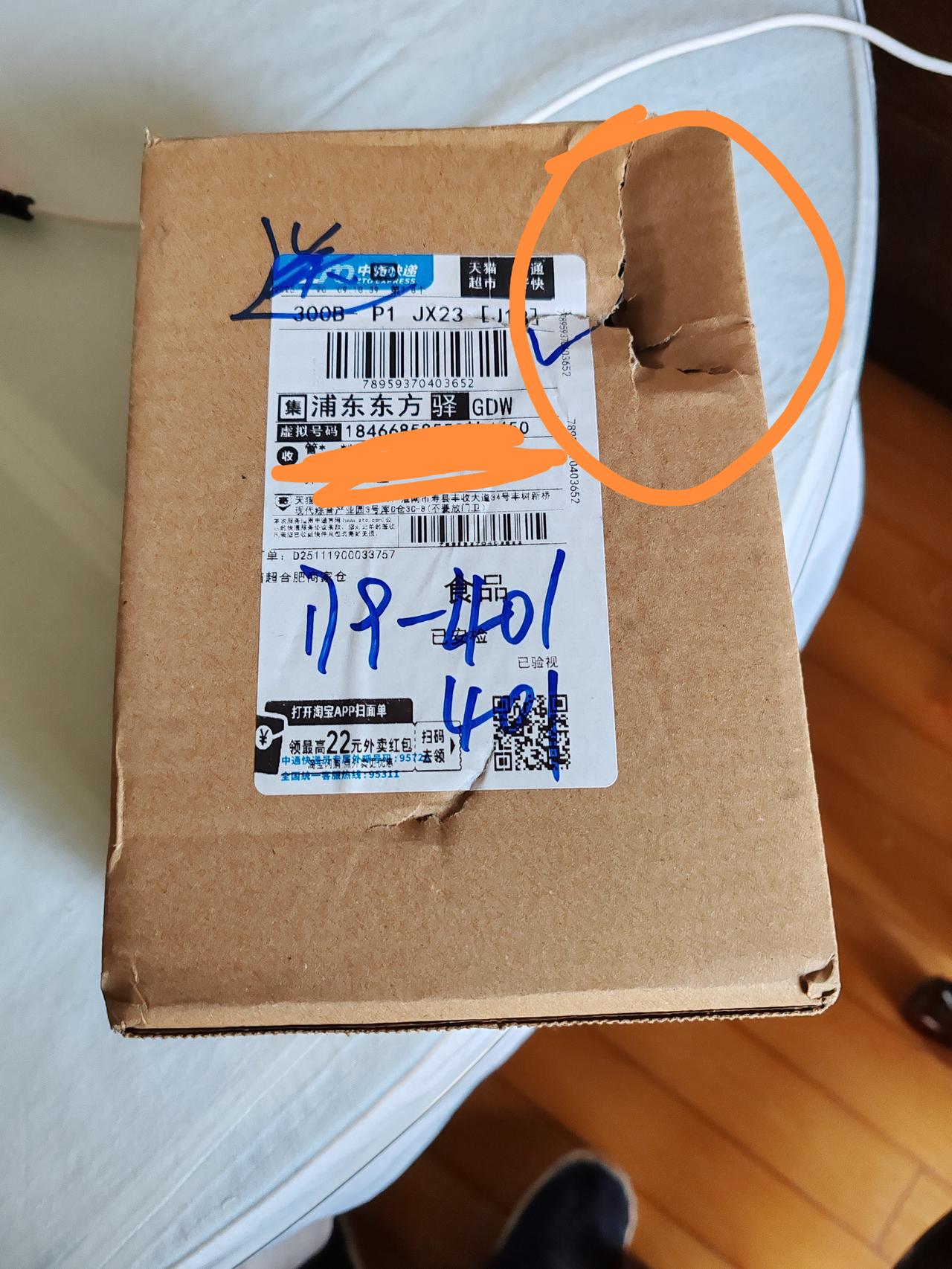 这是在天猫超市买的零食,由中通快递送到家门口的快递盒,然而,在打开前,却发现,包装完整的快递盒上竟然出现明显是人为损坏的破洞,这个人为造成的洞,目的是什么?是不是为了知道里面装的是什么商品?如果是价值高昂的商品,结果又会是怎么样?这个人为造成的破洞,究竟是哪个环节造成的?商家?不可能,他没必要这么做,那只有快递这个环节了。打开后,里面的商品没有少。建议,收到快递盒后,要仔细检查一下,是不是有异常破损的地方,必要时,拍照留下证据,然后再打开,如有缺失,及时向商家索赔,至于由谁承担赔偿责任就和你我没关系也。