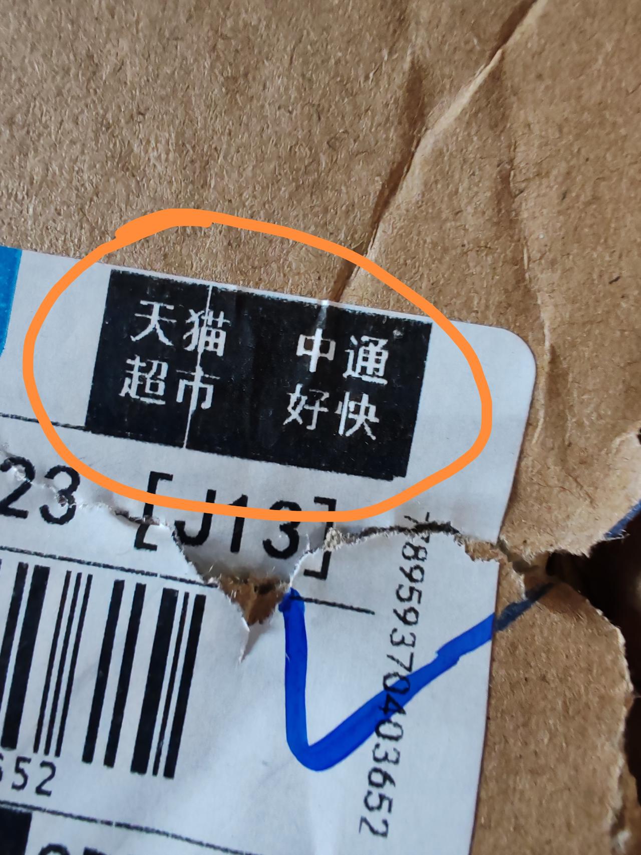 这是在天猫超市买的零食,由中通快递送到家门口的快递盒,然而,在打开前,却发现,包