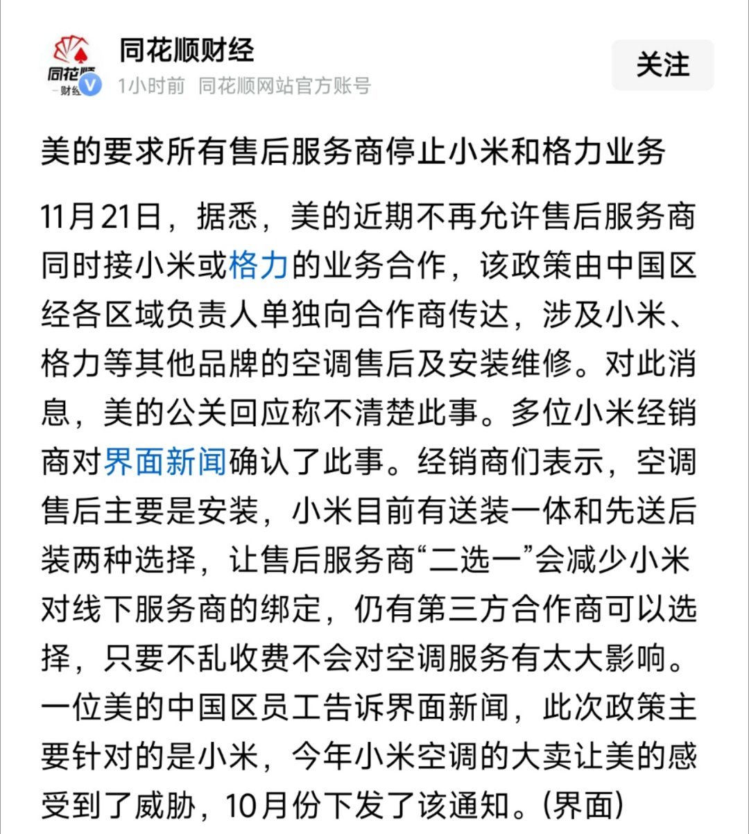 美的要求所有售后服务商停止小米和格力业务小米空调今年卖的是不错,好几个朋友都安了。